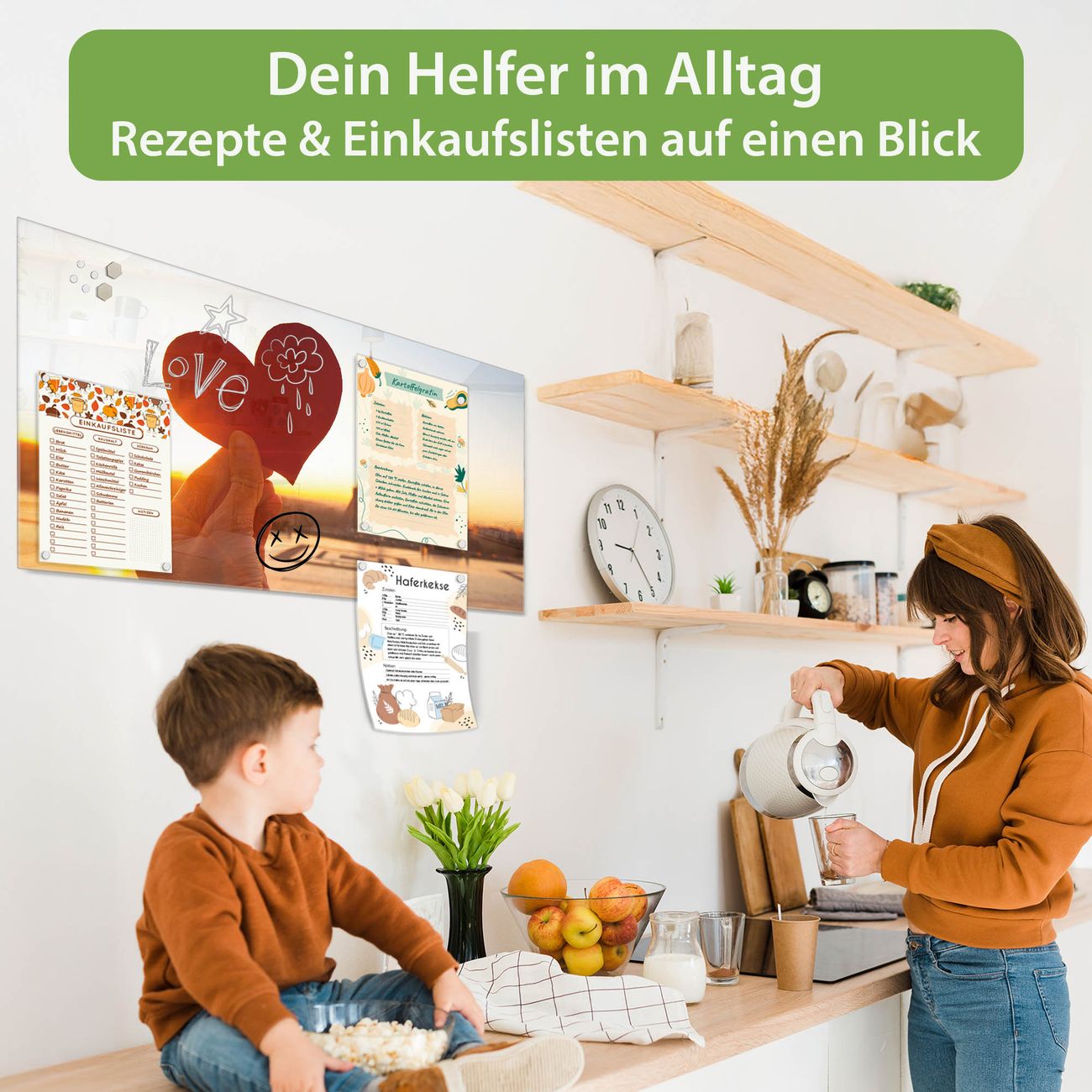 Auf der glatten Glasoberfläche lassen sich Termine, Rezepte oder Notizen ganz einfach mit Kreidestiften festhalten und rückstandslos entfernen. Starke Neodym-Magnete halten Ihre wichtigsten Erinnerungen sicher an Ort und Stelle. So entsteht Ihre ganz persönliche Ideenwand - jeden Tag neu.