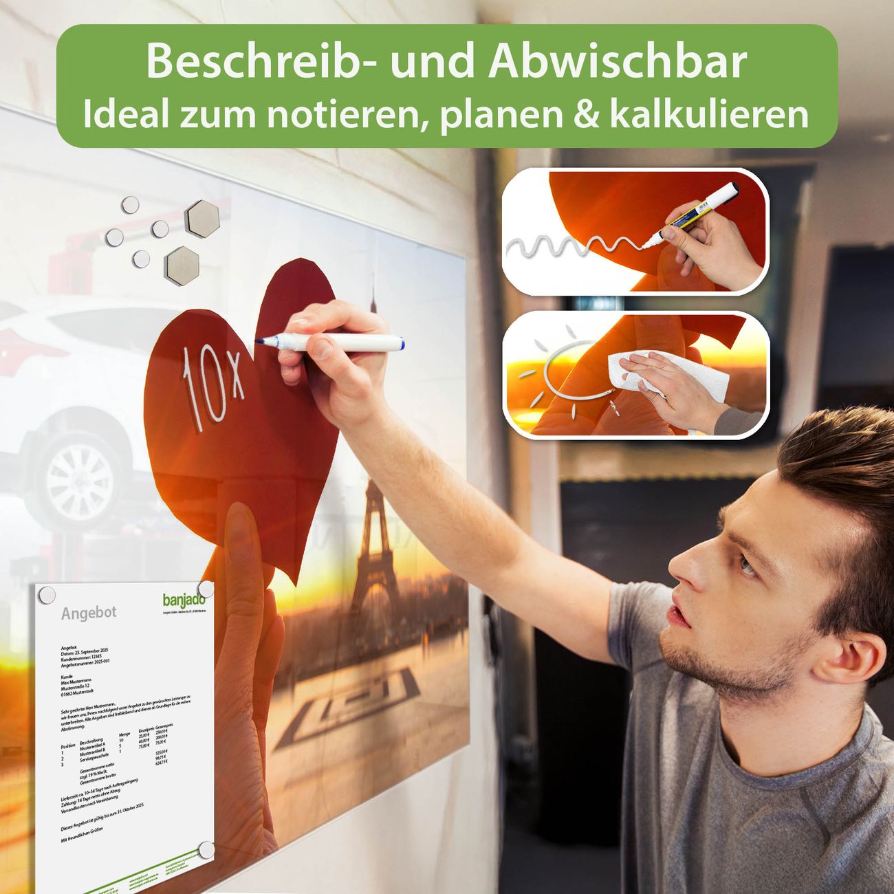 Material: 4mm Sicherheitsglas mit Metallrückwand Eigenschaften: beschreibbar, magnetisch, kratzfest Maße: 75x50x0,6cm, 5,63kg schwer Motiv Nummer 10808 Stadt Der Liebe Zubehör: inklusive 4 Neodym-Magnete