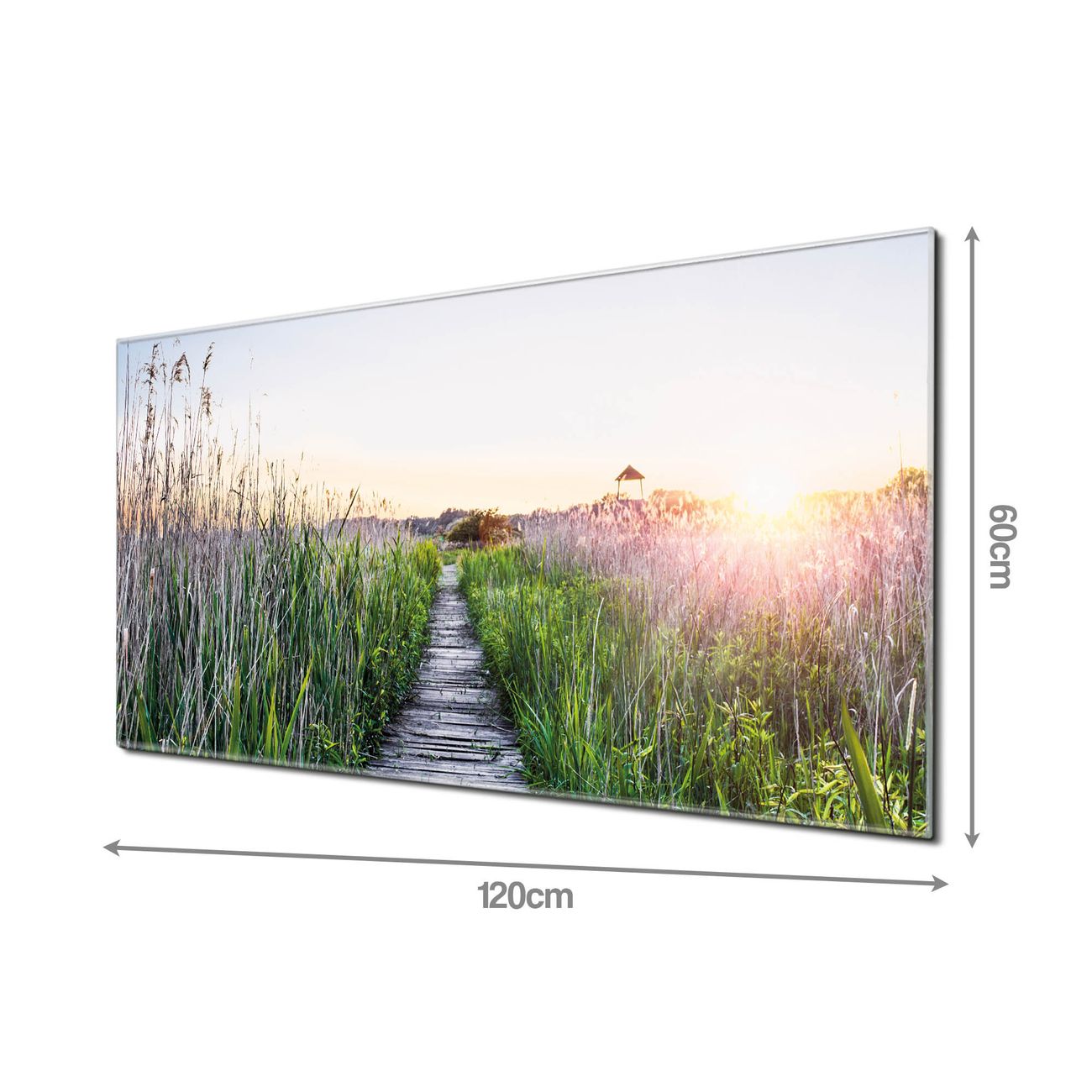 Material: 4mm Sicherheitsglas mit Metallrückwand Eigenschaften: beschreibbar, magnetisch, kratzfest Maße: 120x60x0,6cm, 10,80kg schwer Motiv Nummer 12289 Steg Durchs Schilf Zubehör: inklusive 4 Neodym-Magnete