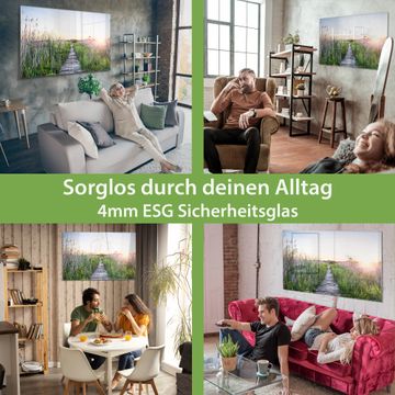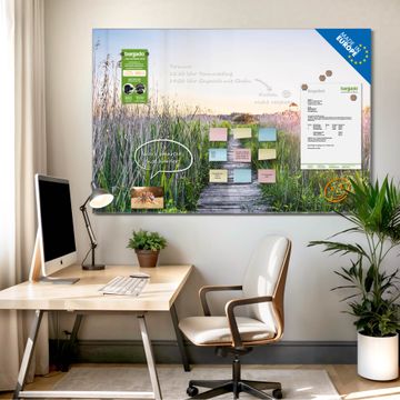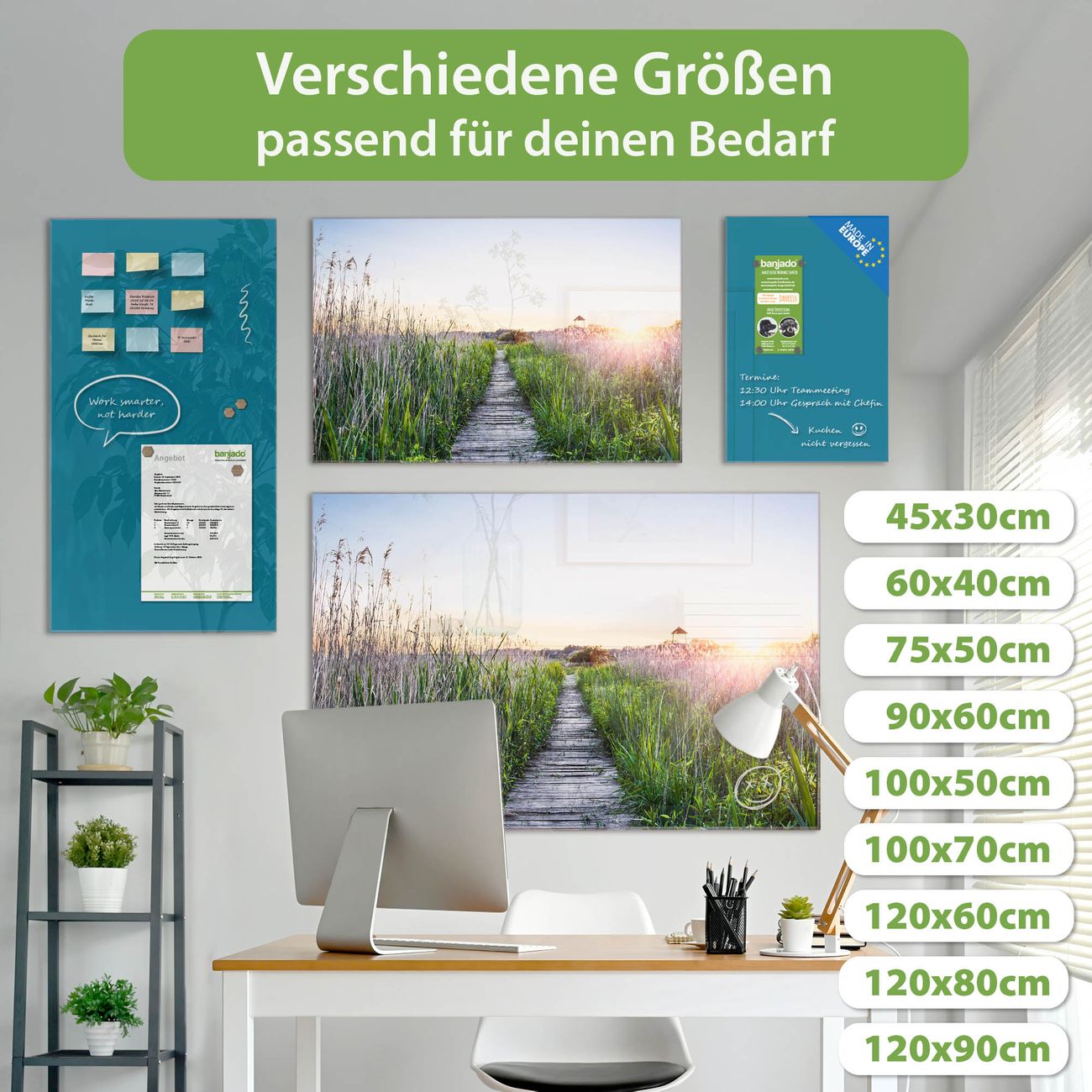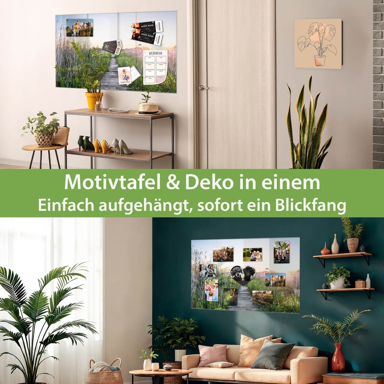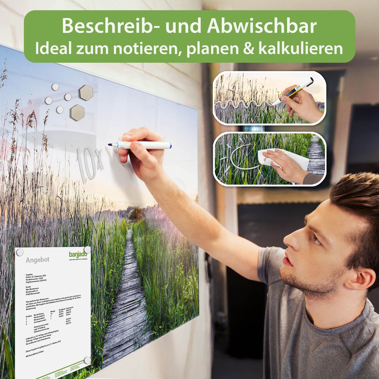 Material: 4mm Sicherheitsglas mit Metallrückwand Eigenschaften: beschreibbar, magnetisch, kratzfest Maße: 120x80x0,6cm, 14,40kg schwer Motiv Nummer 12289 Steg Durchs Schilf Zubehör: inklusive 4 Neodym-Magnete