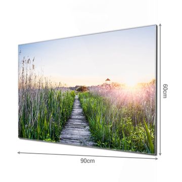 Material: 4mm Sicherheitsglas mit Metallrückwand Eigenschaften: beschreibbar, magnetisch, kratzfest Maße: 90x60x0,6cm, 8,10kg schwer Motiv Nummer 12289 Steg Durchs Schilf Zubehör: inklusive 4 Neodym-Magnete