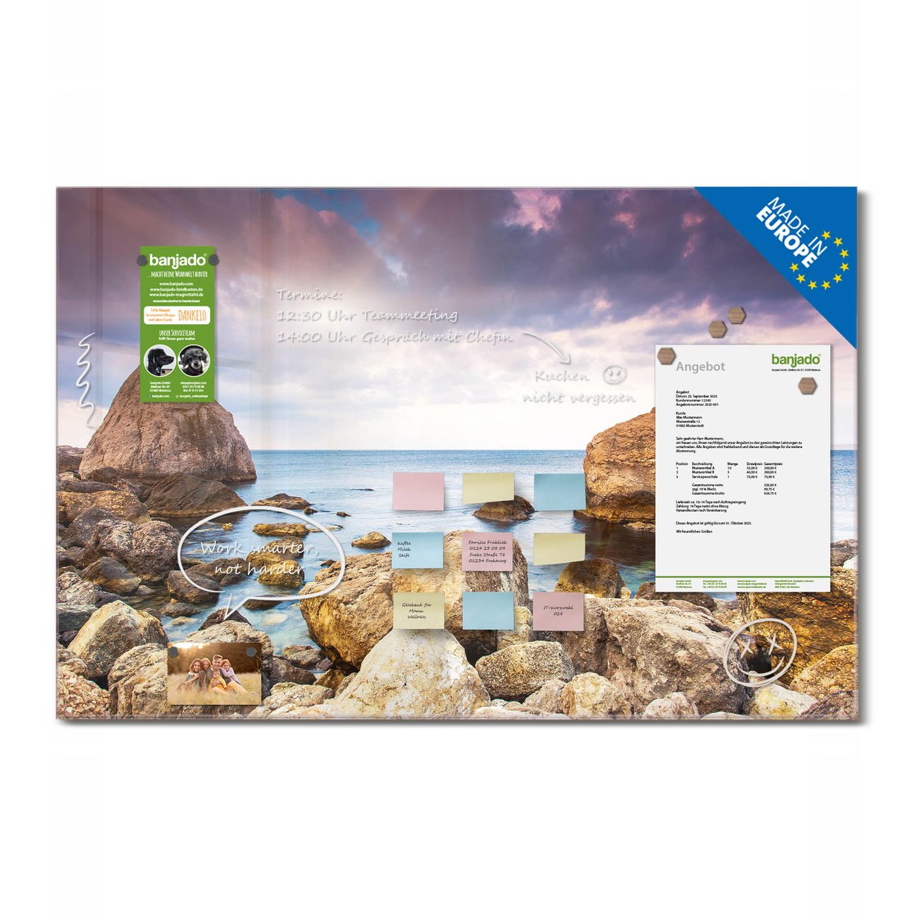 Material: 4mm Sicherheitsglas mit Metallrückwand Eigenschaften: beschreibbar, magnetisch, kratzfest Maße: 120x80x0,6cm, 14,40kg schwer Motiv Nummer 12333 Steinbucht Zubehör: inklusive 4 Neodym-Magnete
