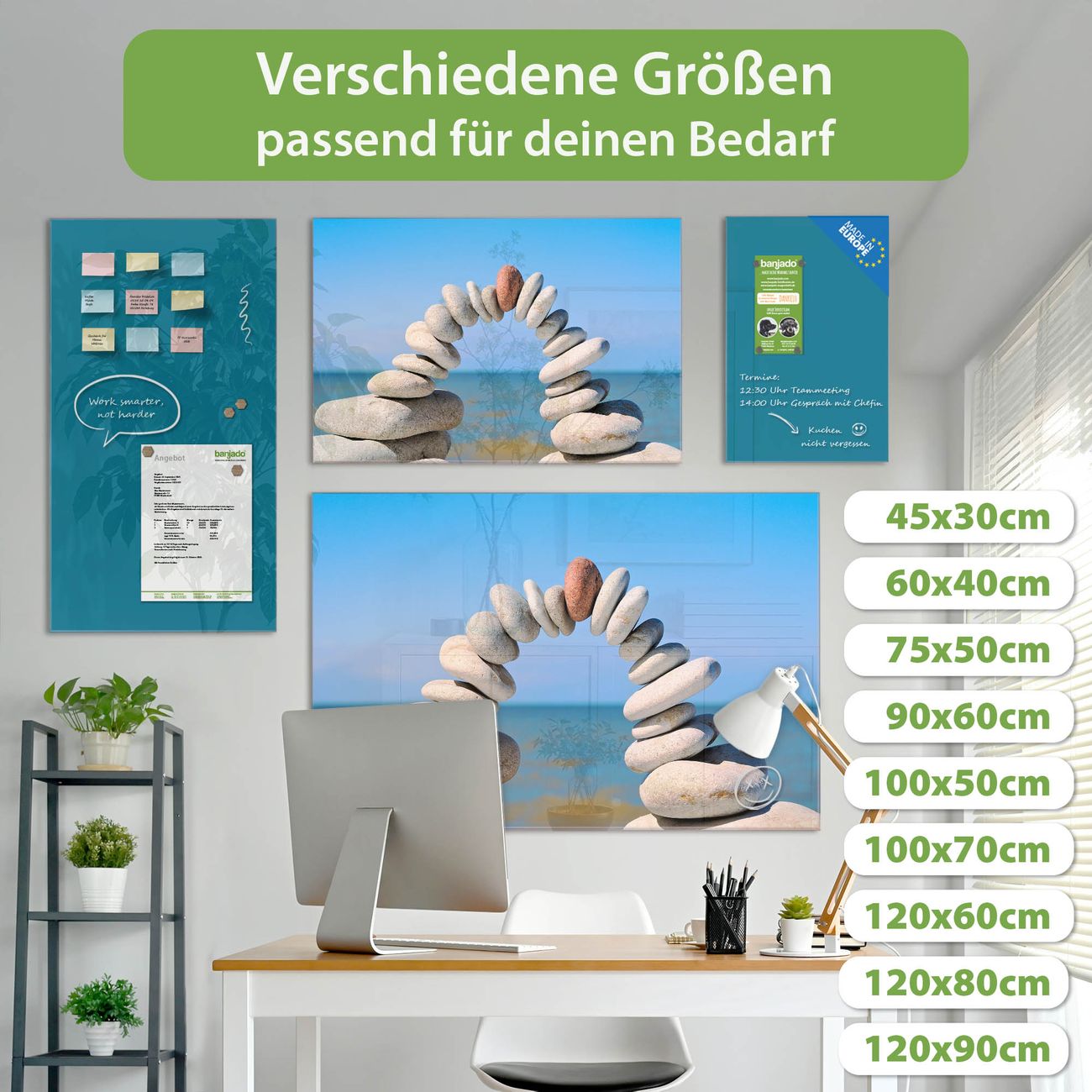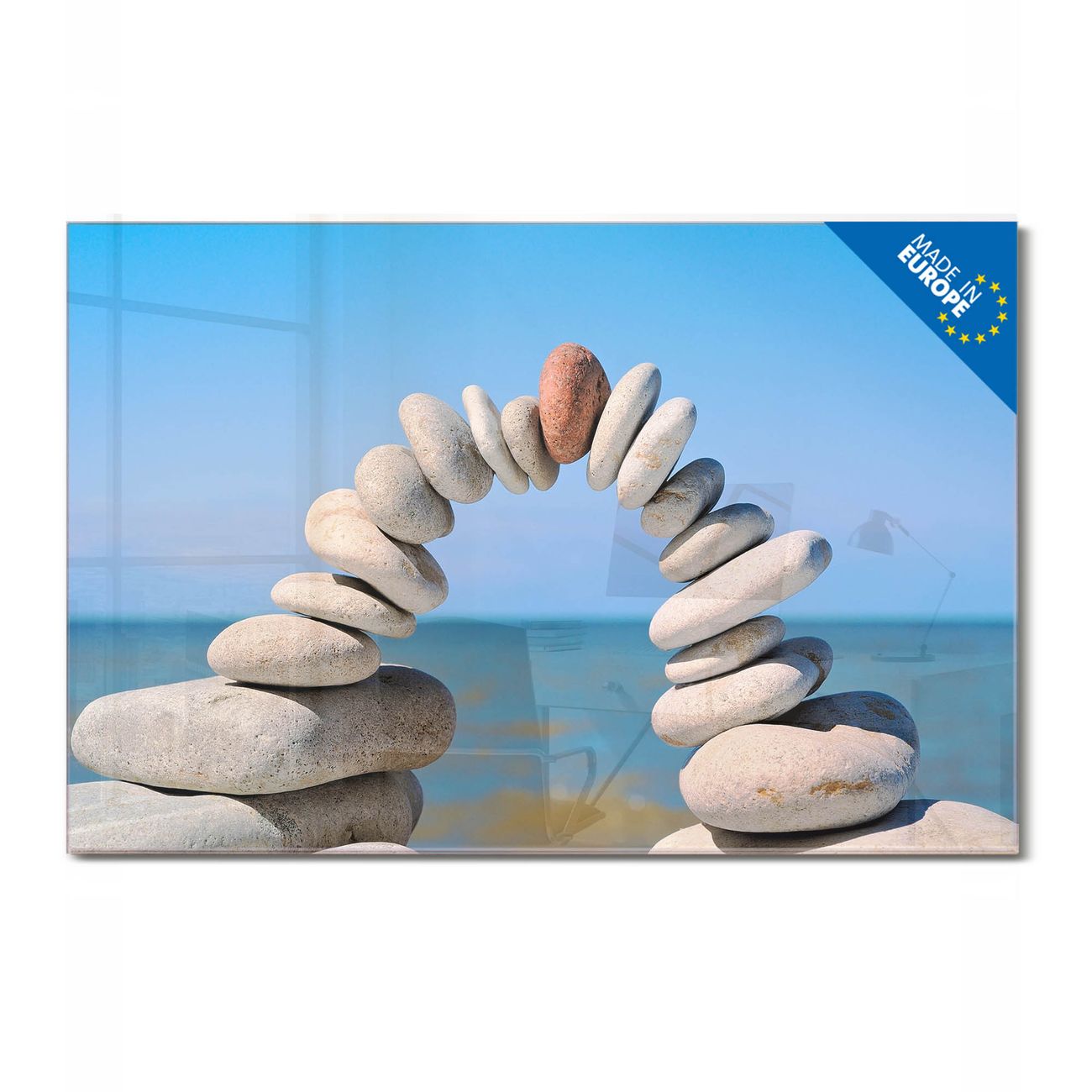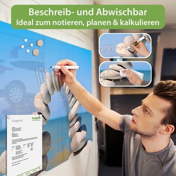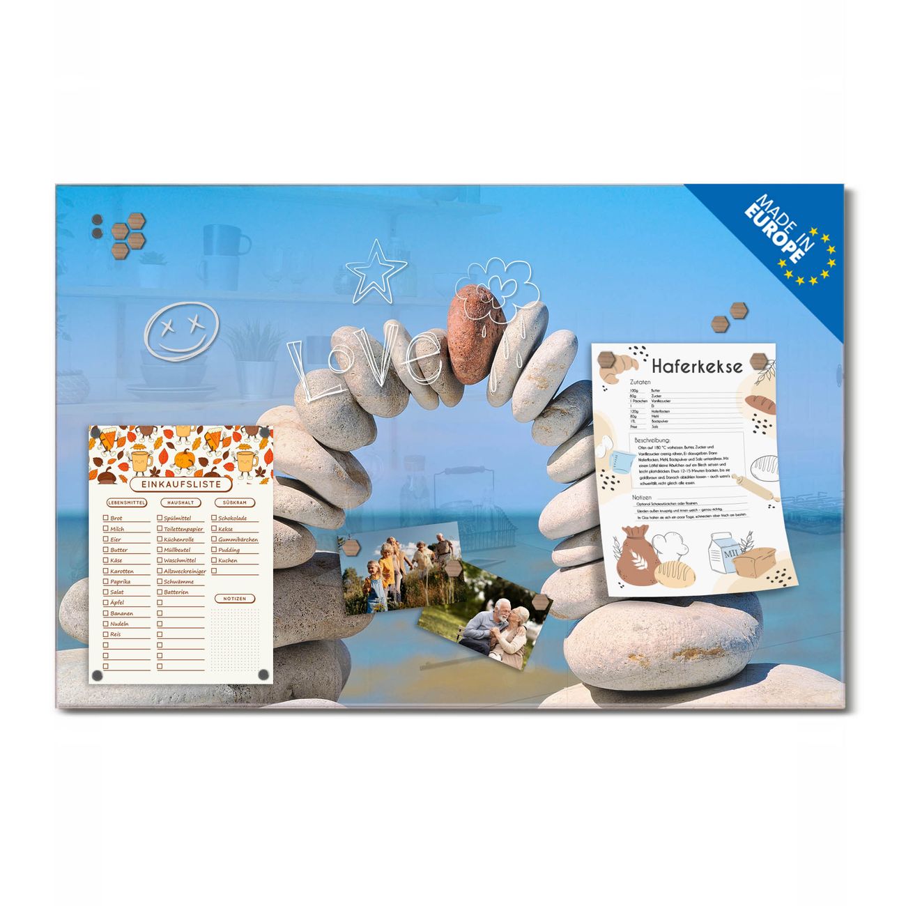 Material: 4mm Sicherheitsglas mit Metallrückwand Eigenschaften: beschreibbar, magnetisch, kratzfest Maße: 75x50x0,6cm, 5,63kg schwer Motiv Nummer 10024 Steine&Meer Zubehör: inklusive 4 Neodym-Magnete