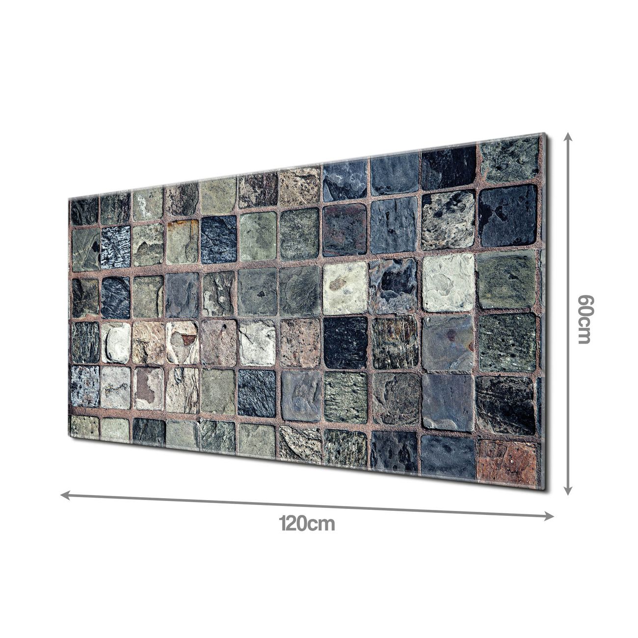 Material: 4mm Sicherheitsglas mit Metallrückwand Eigenschaften: beschreibbar, magnetisch, kratzfest Maße: 120x60x0,6cm, 10,80kg schwer Motiv Nummer 11420 Steinfliesen Zubehör: inklusive 4 Neodym-Magnete