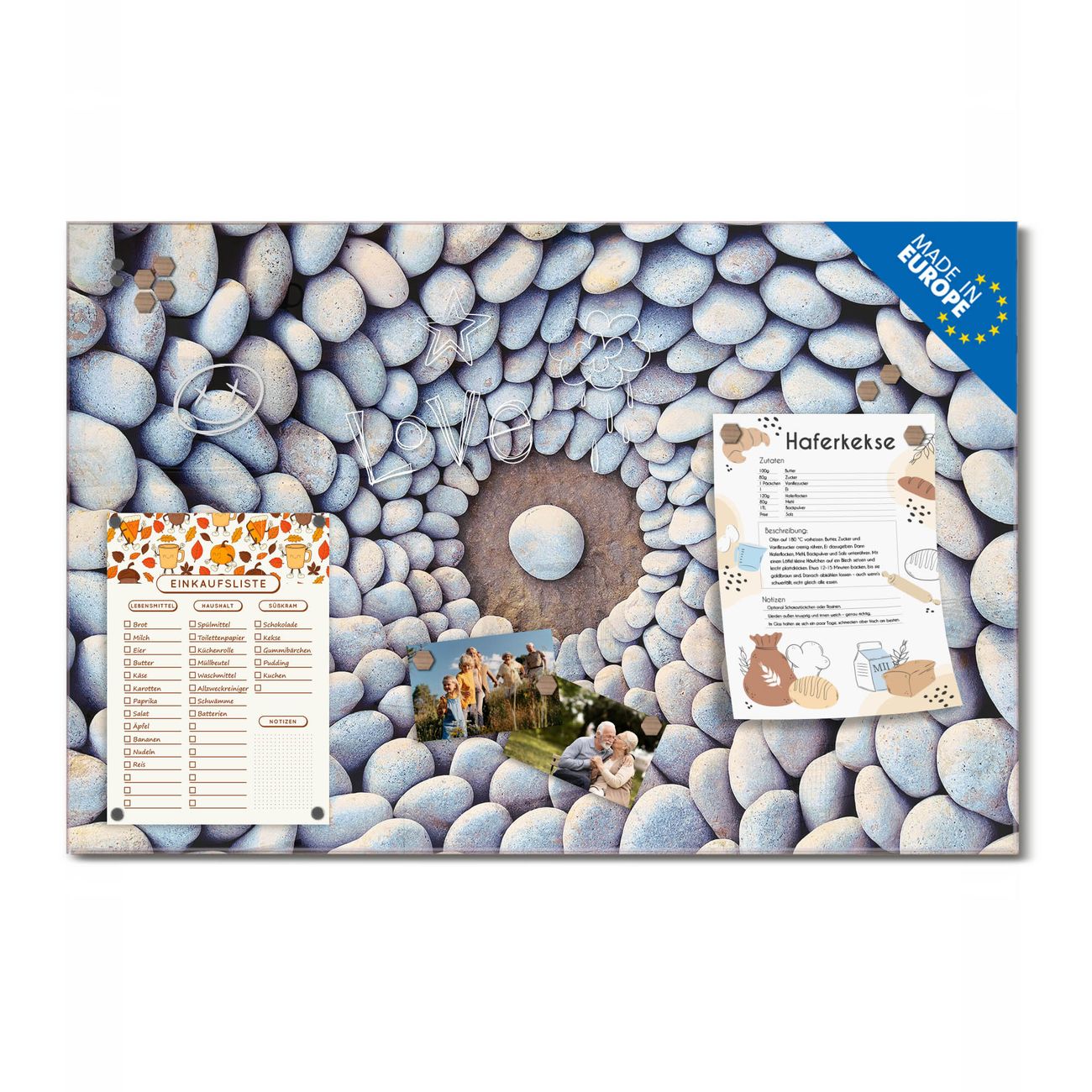 Ein Stück Design, das Ihren Alltag organisiert. Schreiben, heften, inspirieren - alles an einem Ort. Qualität, die man spürt. Montage leicht gemacht. Handwerk mit Herz - veredelt in Sachsen. Einzigartiges Design mit Motiv Motiv Steinkreis Beschreibbare Glasoberfläche, leicht zu reinigen Starke Magnetkraft durch Stahlrückwand Inklusive 4 Neodym-Magneten Flexible Montageoptionen Handveredelt in Sachsen - Qualität, die bleibt