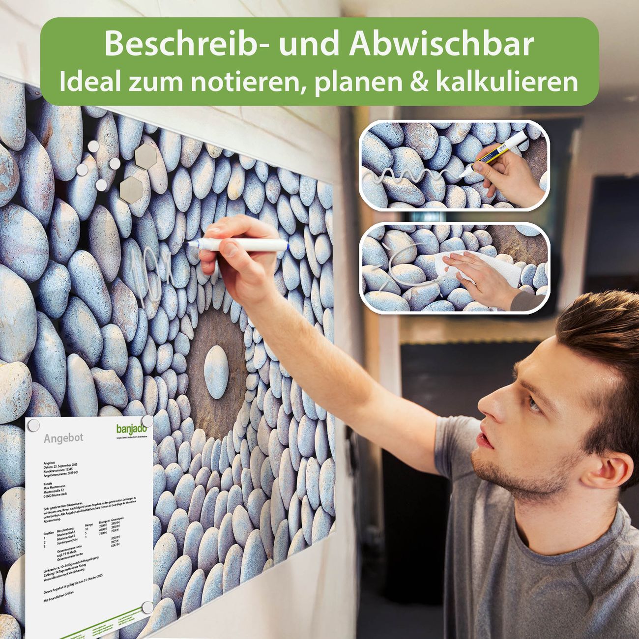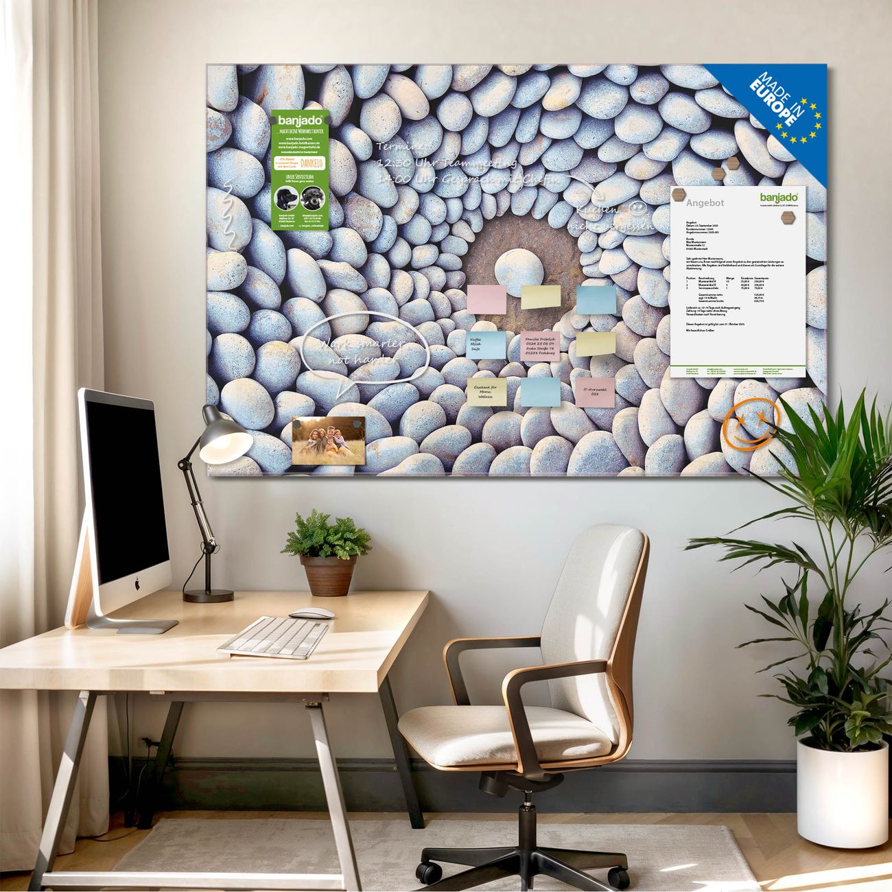 Jede Glas Magnettafel wird in unserer Werkstatt von Hand gefertigt und sorgfältig geprüft. So erhalten Sie ein echtes Qualitätsprodukt, das Funktion und Ästhetik perfekt vereint.?? Warum banjado?