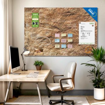 Material: 4mm Sicherheitsglas mit Metallrückwand Eigenschaften: beschreibbar, magnetisch, kratzfest Maße: 45x30x0,6cm, 2,03kg schwer Motiv Nummer 11519 Steinstruktur Zubehör: inklusive 4 Neodym-Magnete