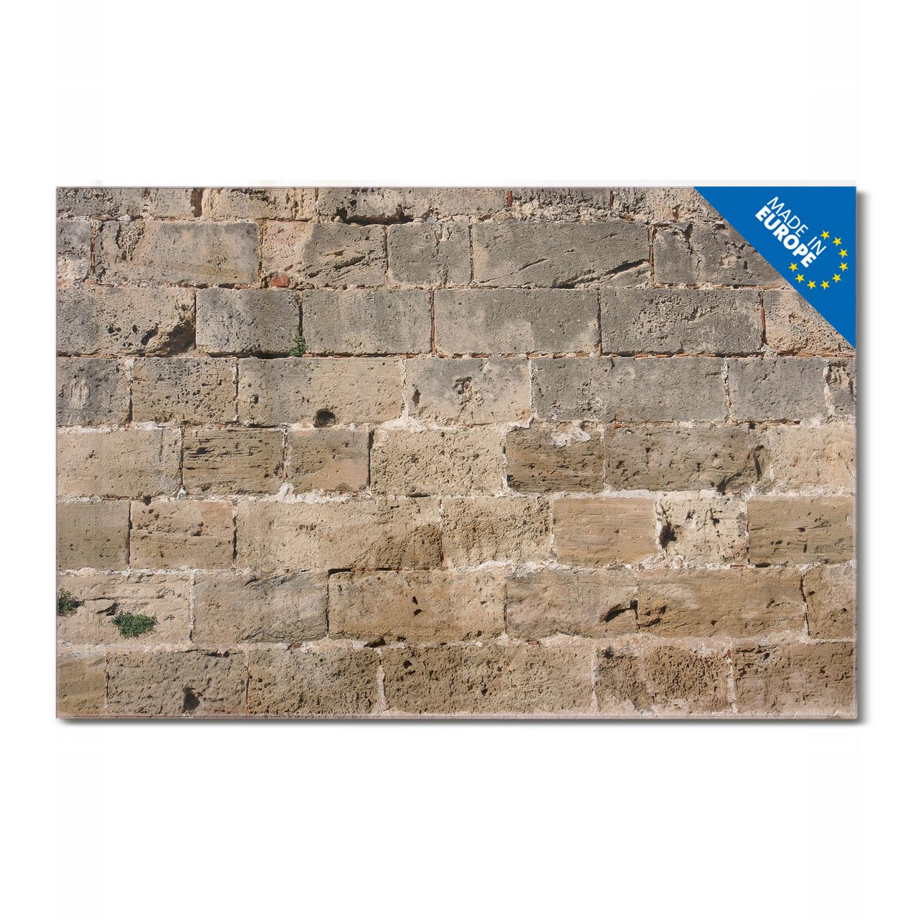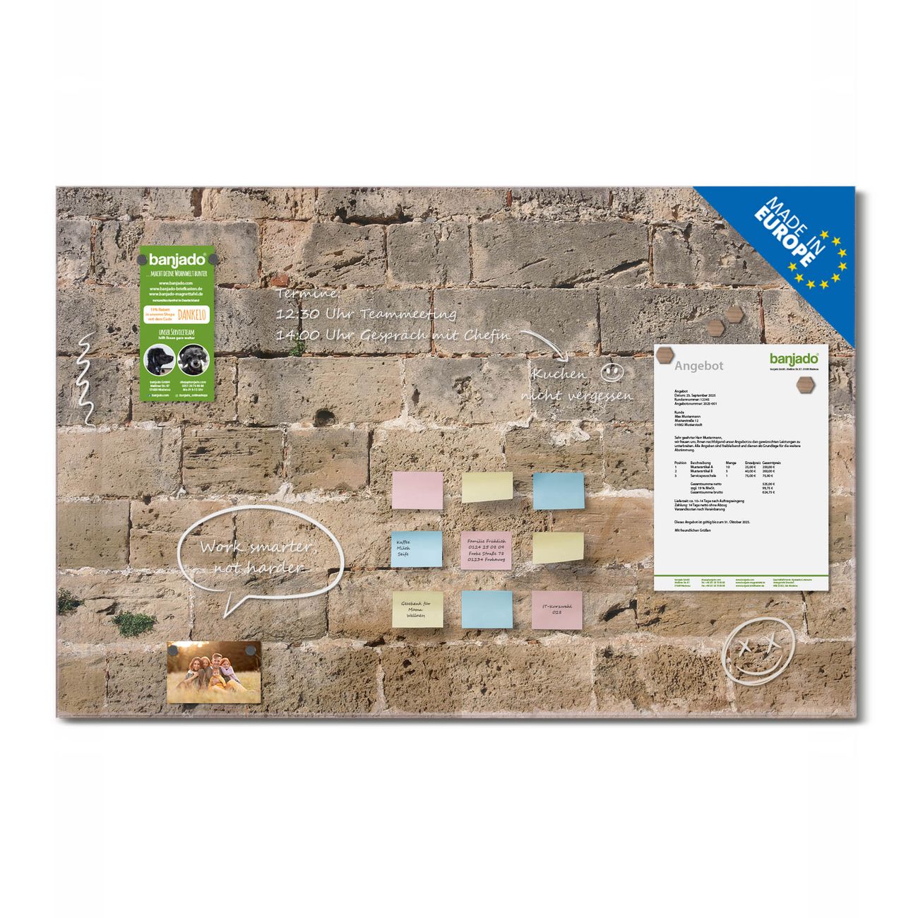 Material: 4mm Sicherheitsglas mit Metallrückwand Eigenschaften: beschreibbar, magnetisch, kratzfest Maße: 90x60x0,6cm, 8,10kg schwer Motiv Nummer 10043 Steinwand Antik Zubehör: inklusive 4 Neodym-Magnete