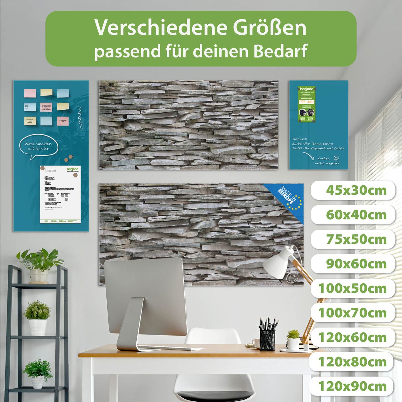 Material: 4mm Sicherheitsglas mit Metallrückwand Eigenschaften: beschreibbar, magnetisch, kratzfest Maße: 100x50x0,6cm, 7,50kg schwer Motiv Nummer 10026 Steinwand Zubehör: inklusive 4 Neodym-Magnete