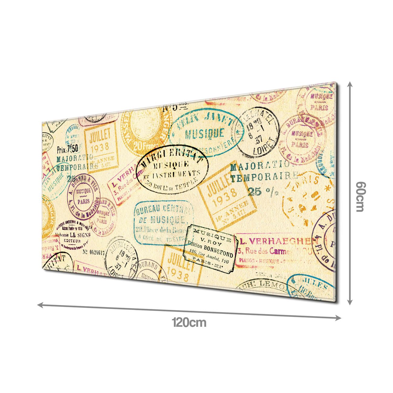 Material: 4mm Sicherheitsglas mit Metallrückwand Eigenschaften: beschreibbar, magnetisch, kratzfest Maße: 120x60x0,6cm, 10,80kg schwer Motiv Nummer 10574 Stempel Zubehör: inklusive 4 Neodym-Magnete