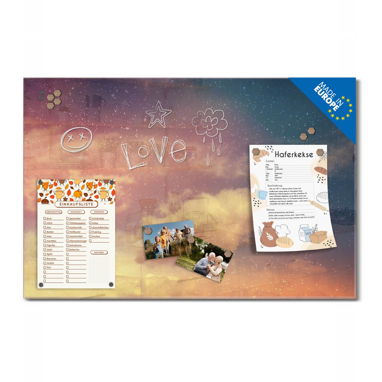 Material: 4mm Sicherheitsglas mit Metallrückwand Eigenschaften: beschreibbar, magnetisch, kratzfest Maße: 75x50x0,6cm, 5,63kg schwer Motiv Nummer 12719 Sternenhimmel Zubehör: inklusive 4 Neodym-Magnete