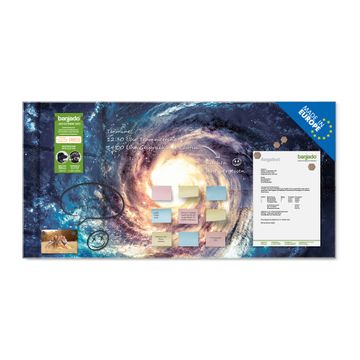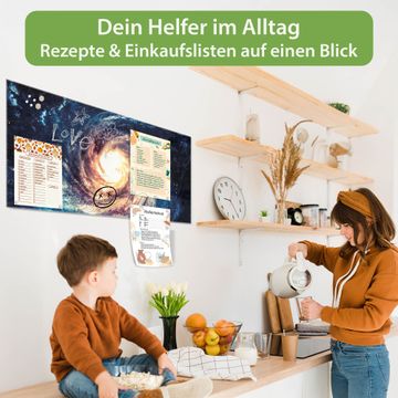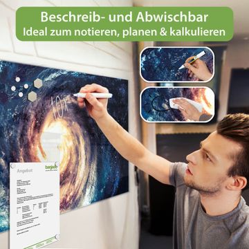 Material: 4mm Sicherheitsglas mit Metallrückwand Eigenschaften: beschreibbar, magnetisch, kratzfest Maße: 100x50x0,6cm, 7,50kg schwer Motiv Nummer 10459 Sternenwirbel Zubehör: inklusive 4 Neodym-Magnete