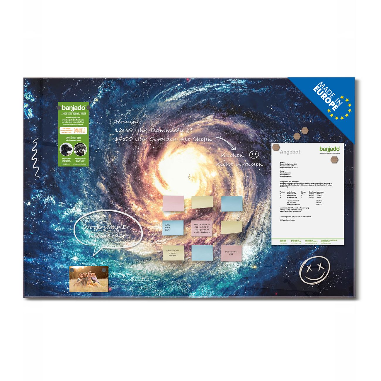 Ein Stück Design, das Ihren Alltag organisiert. Schreiben, heften, inspirieren - alles an einem Ort. Qualität, die man spürt. Montage leicht gemacht. Handwerk mit Herz - veredelt in Sachsen. Einzigartiges Design mit Motiv Motiv Sternenwirbel Beschreibbare Glasoberfläche, leicht zu reinigen Starke Magnetkraft durch Stahlrückwand Inklusive 4 Neodym-Magneten Flexible Montageoptionen Handveredelt in Sachsen - Qualität, die bleibt