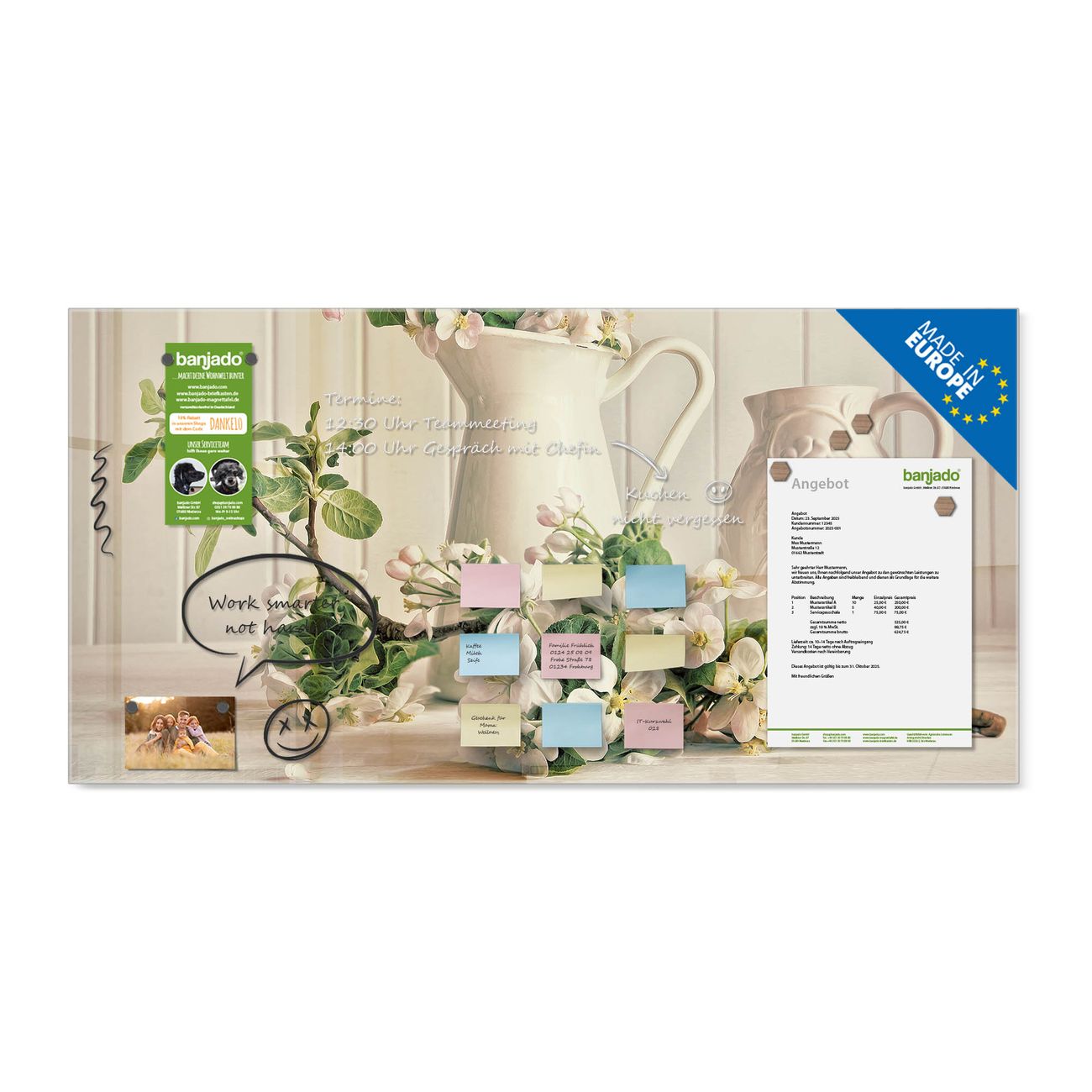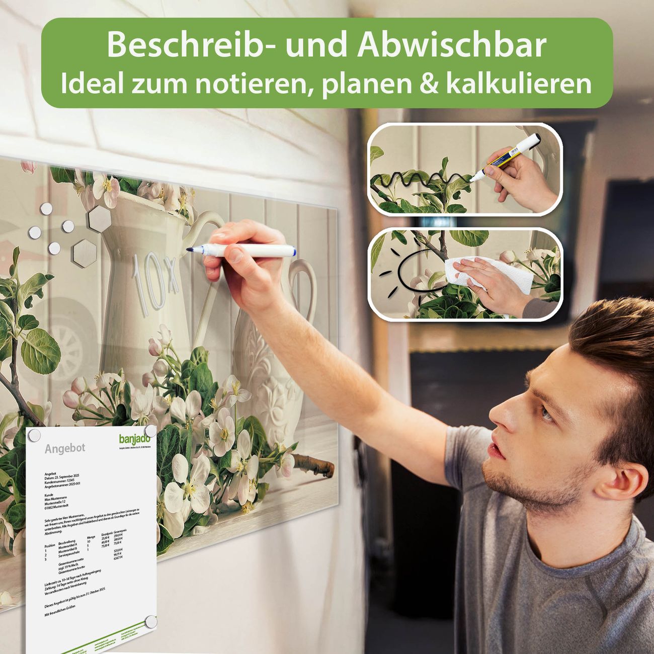 Jede Glas Magnettafel wird in unserer Werkstatt von Hand gefertigt und sorgfältig geprüft. So erhalten Sie ein echtes Qualitätsprodukt, das Funktion und Ästhetik perfekt vereint.?? Warum banjado?
