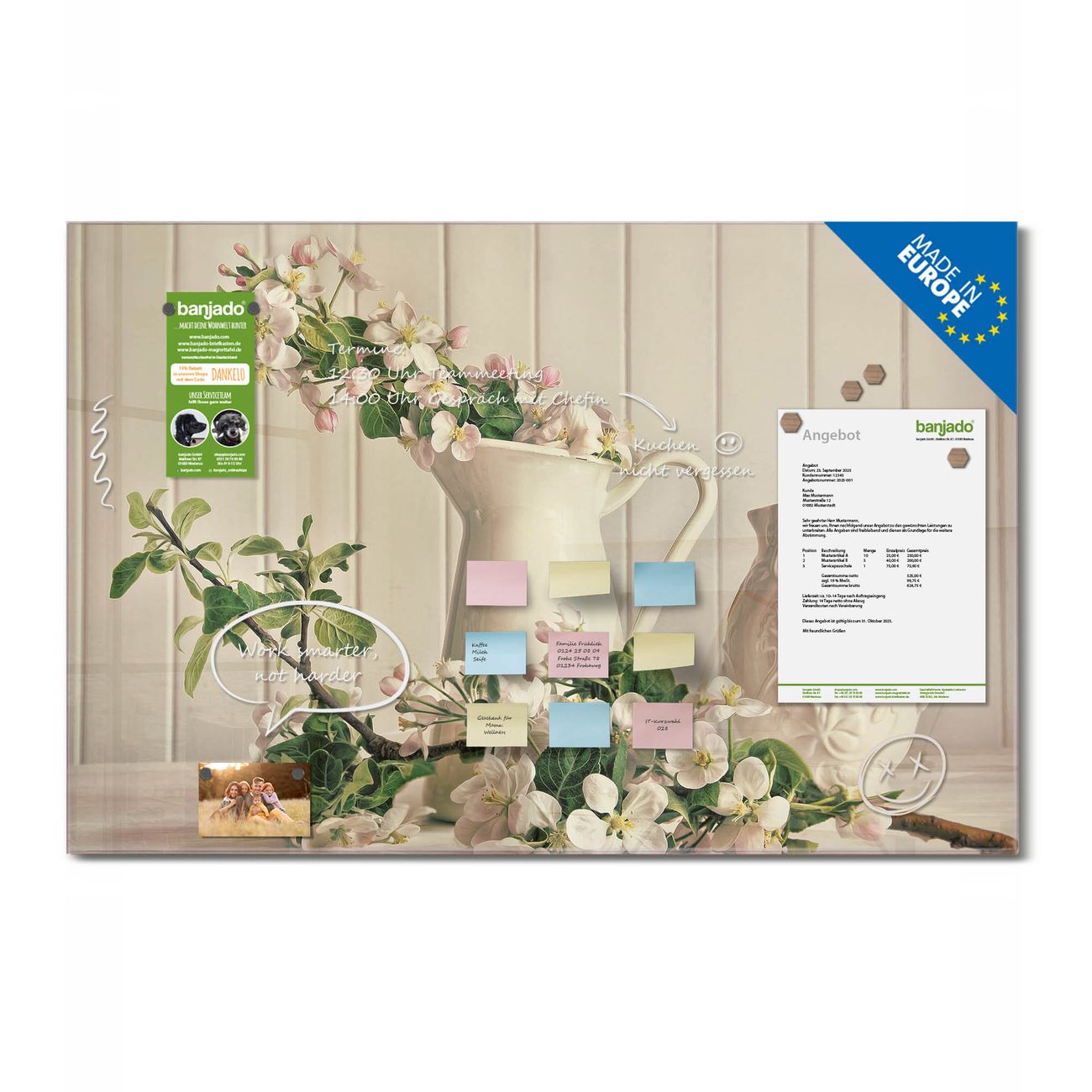 Jede Glas Magnettafel wird in unserer Werkstatt von Hand gefertigt und sorgfältig geprüft. So erhalten Sie ein echtes Qualitätsprodukt, das Funktion und Ästhetik perfekt vereint.?? Warum banjado?