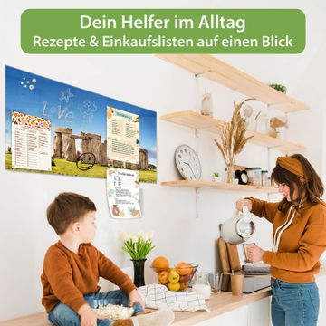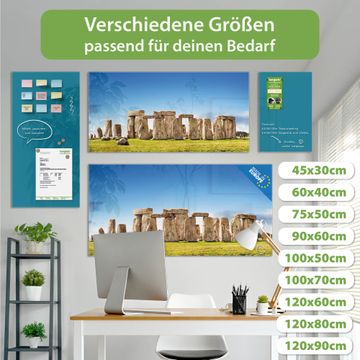 Material: 4mm Sicherheitsglas mit Metallrückwand Eigenschaften: beschreibbar, magnetisch, kratzfest Maße: 100x50x0,6cm, 7,50kg schwer Motiv Nummer 12401 Stonehenge Zubehör: inklusive 4 Neodym-Magnete