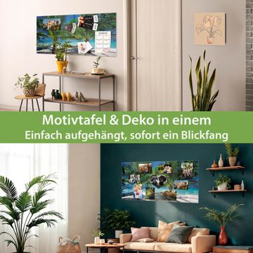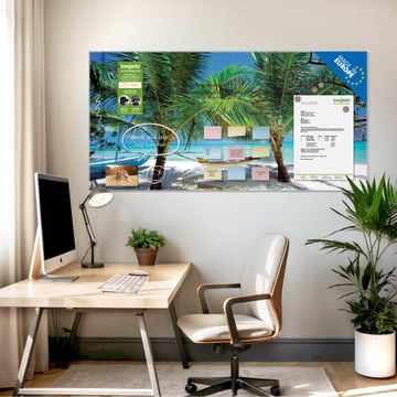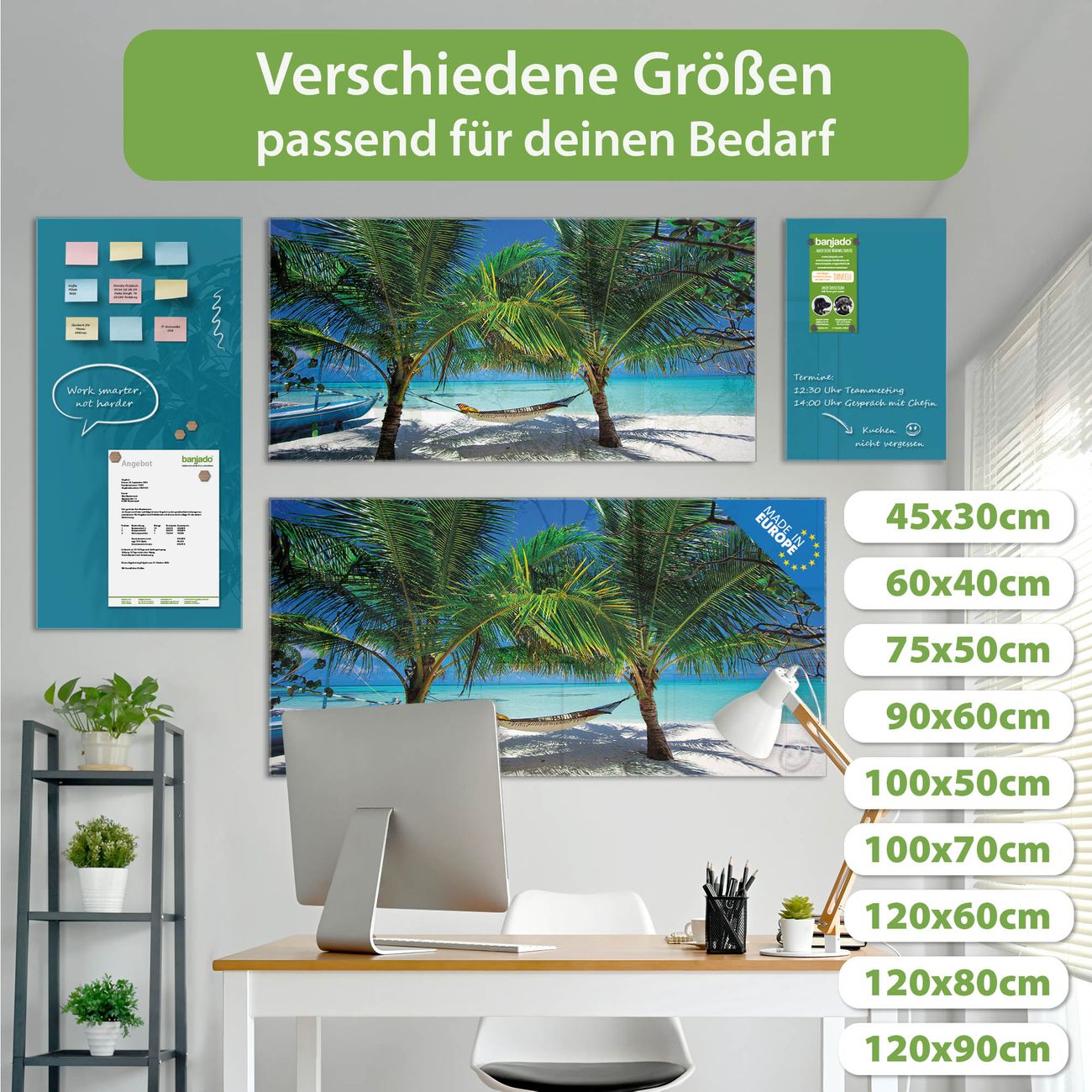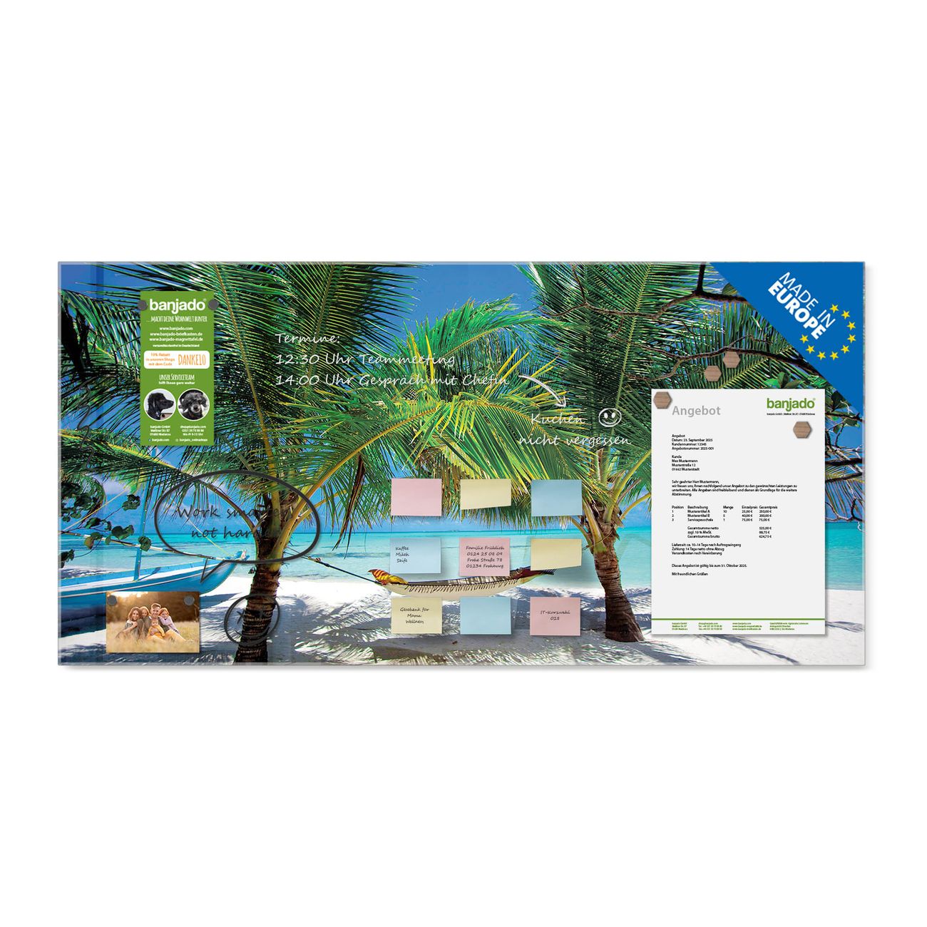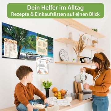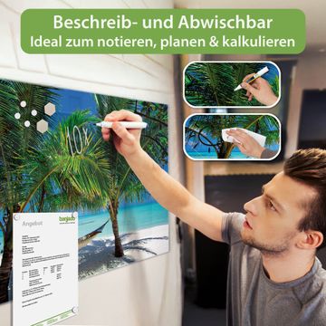 Material: 4mm Sicherheitsglas mit Metallrückwand Eigenschaften: beschreibbar, magnetisch, kratzfest Maße: 100x50x0,6cm, 7,50kg schwer Motiv Nummer 10027 Strand Zubehör: inklusive 4 Neodym-Magnete