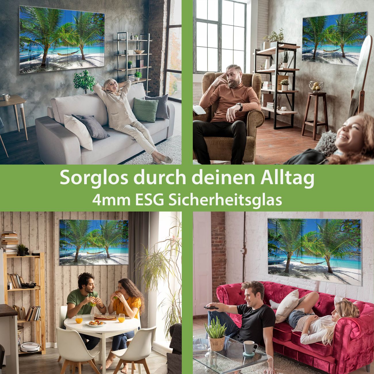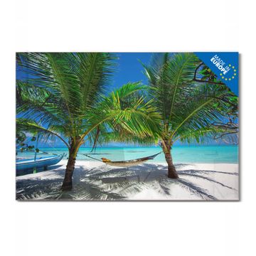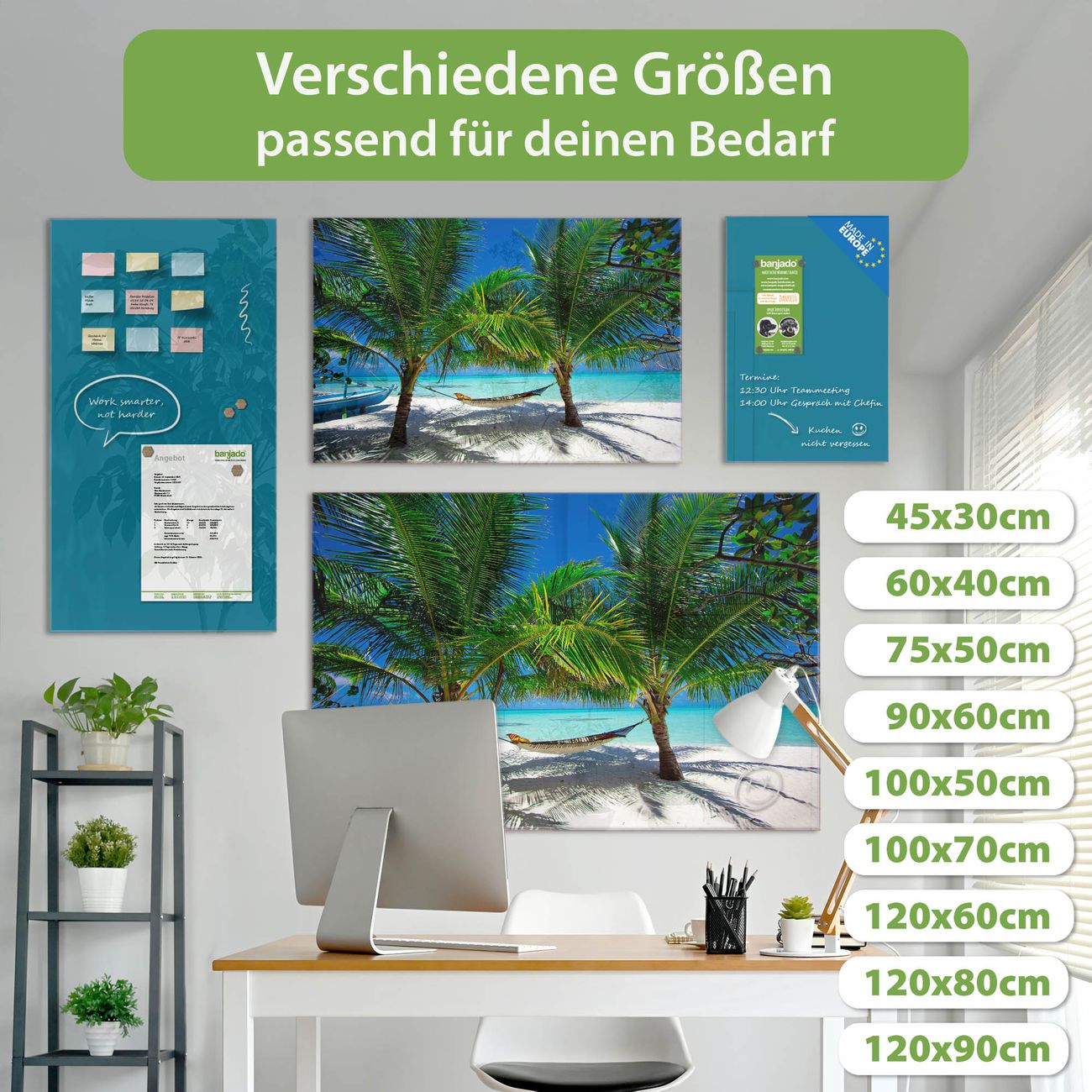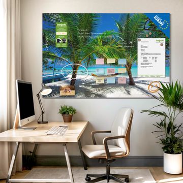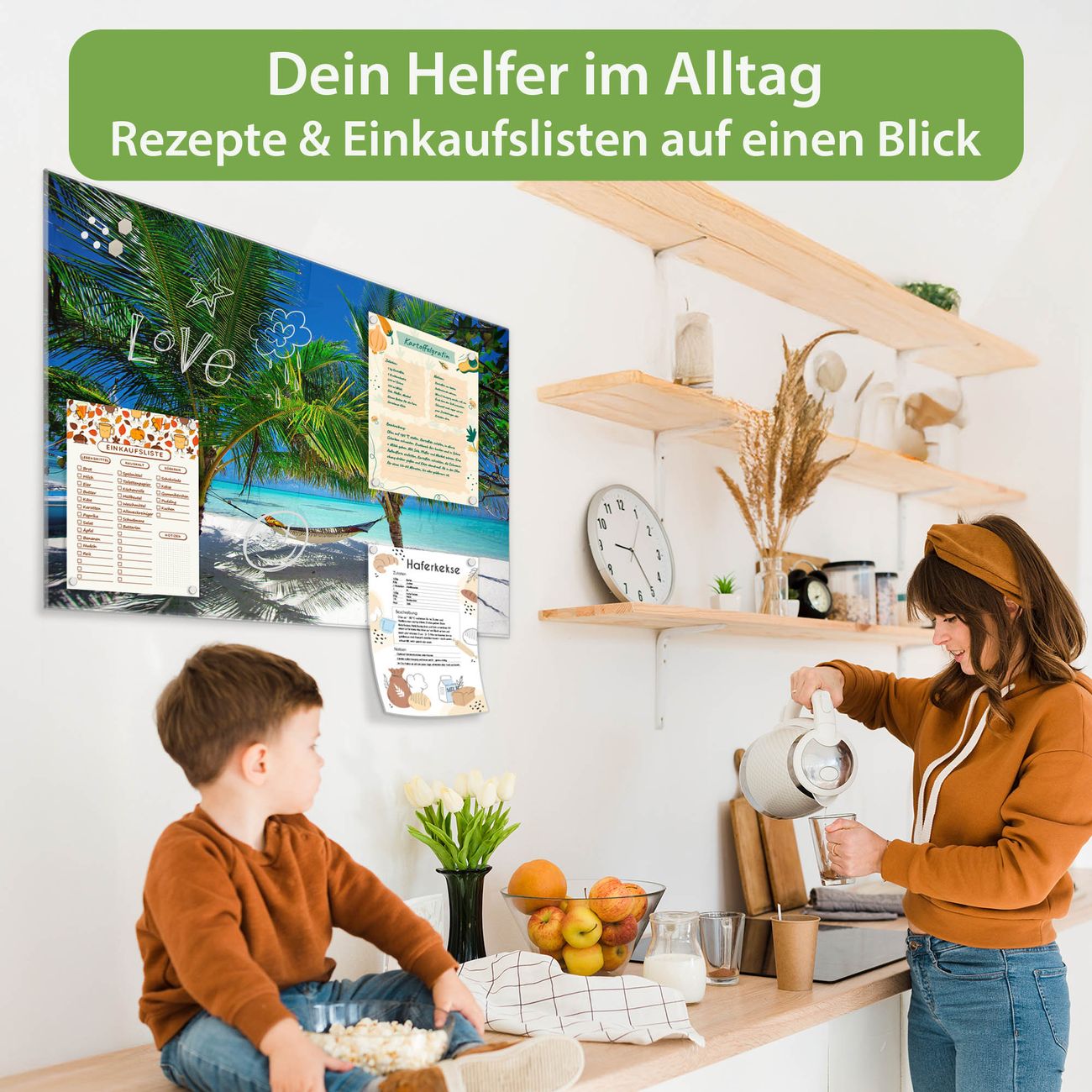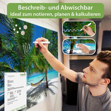 Material: 4mm Sicherheitsglas mit Metallrückwand Eigenschaften: beschreibbar, magnetisch, kratzfest Maße: 75x50x0,6cm, 5,63kg schwer Motiv Nummer 10027 Strand Zubehör: inklusive 4 Neodym-Magnete
