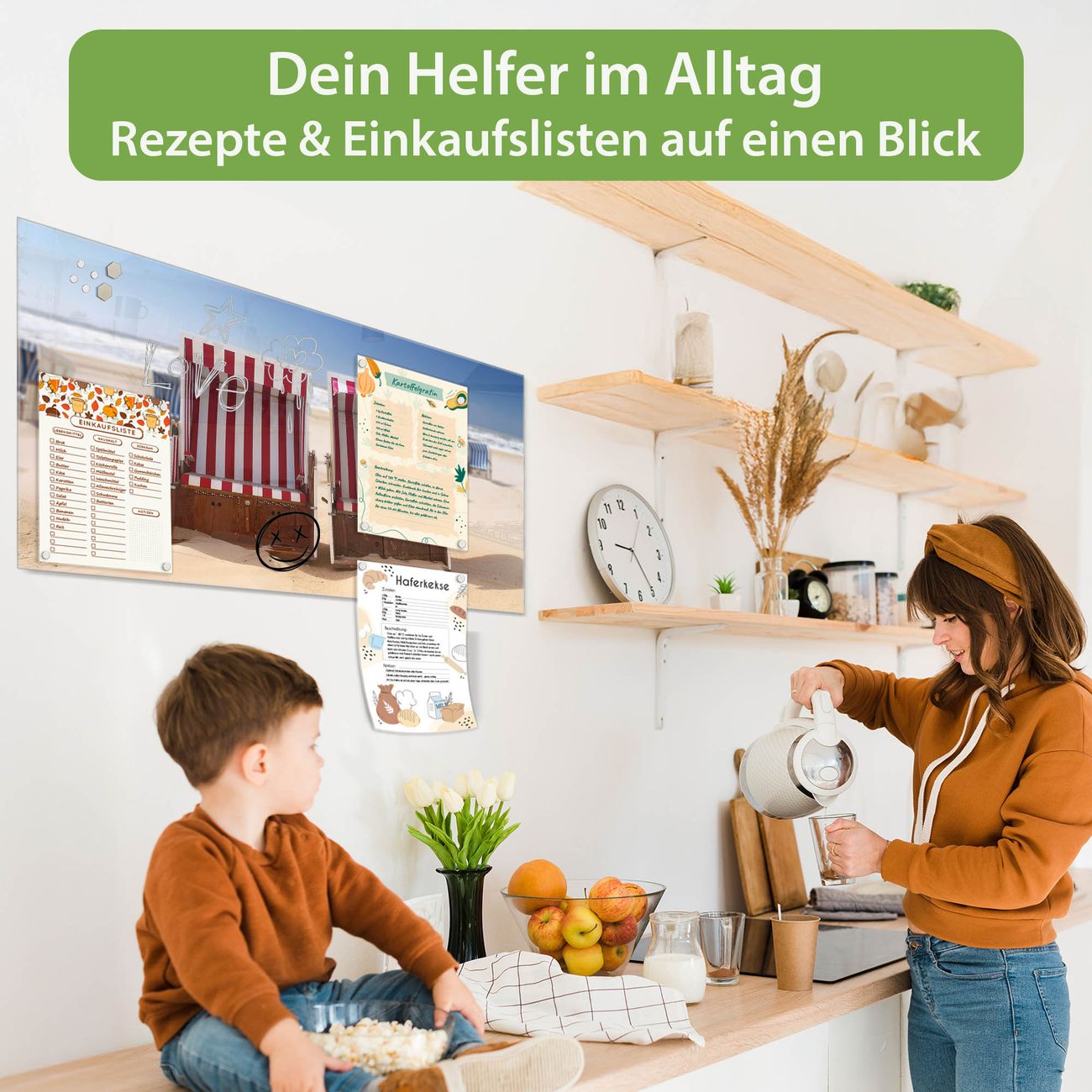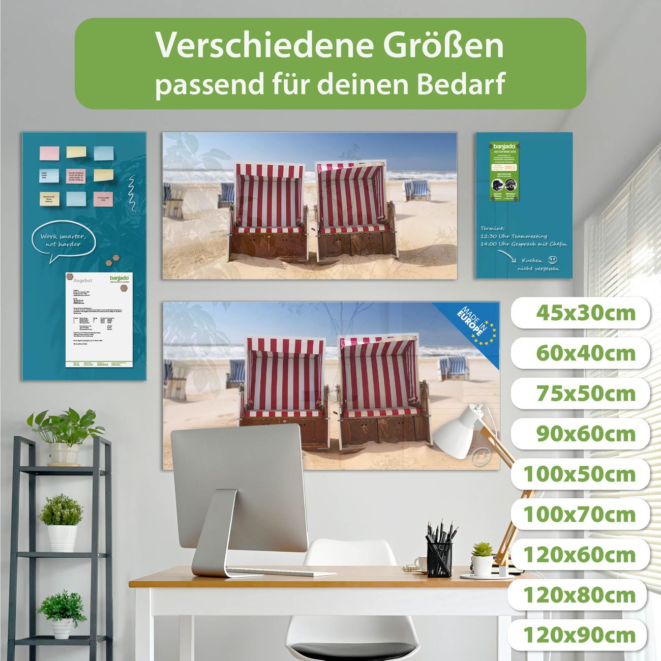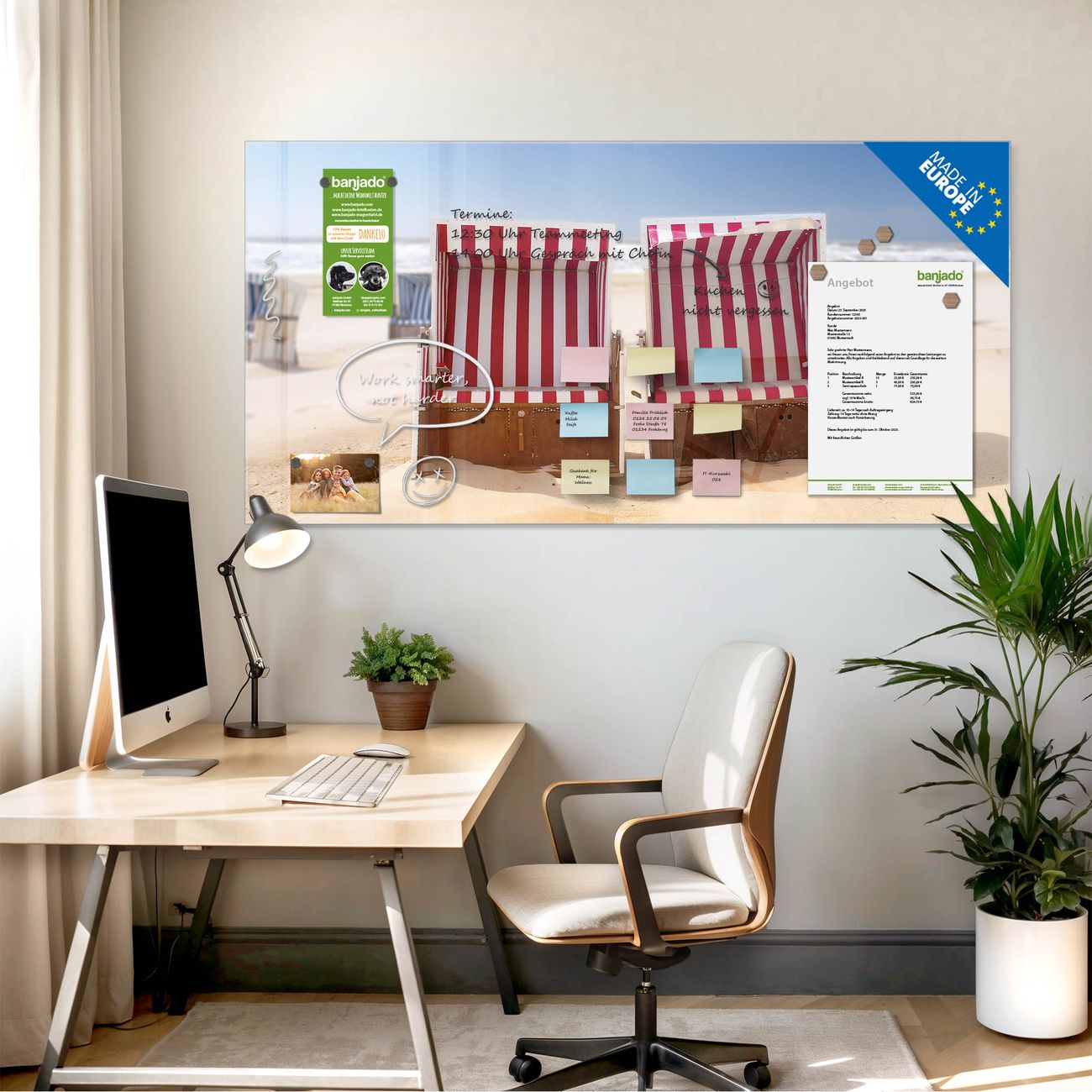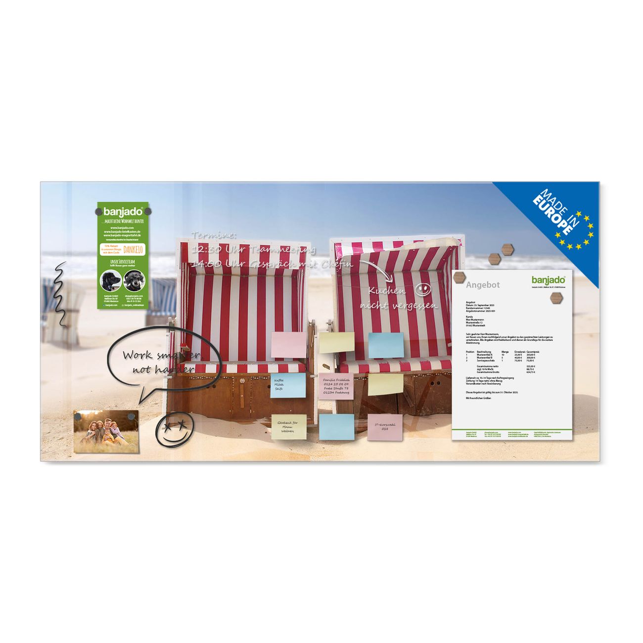 Ein Stück Design, das Ihren Alltag organisiert. Schreiben, heften, inspirieren - alles an einem Ort. Qualität, die man spürt. Montage leicht gemacht. Handwerk mit Herz - veredelt in Sachsen. Einzigartiges Design mit Motiv Motiv Strandkörbe Beschreibbare Glasoberfläche, leicht zu reinigen Starke Magnetkraft durch Stahlrückwand Inklusive 4 Neodym-Magneten Flexible Montageoptionen Handveredelt in Sachsen - Qualität, die bleibt