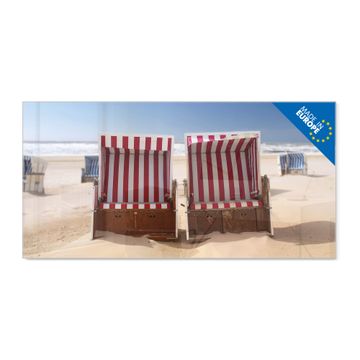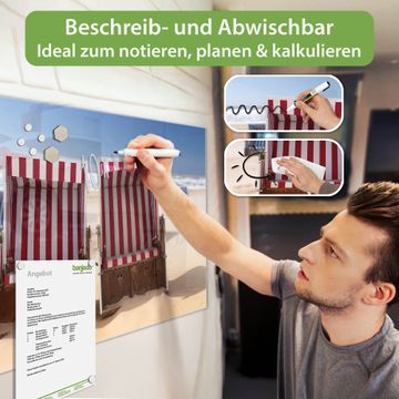 Material: 4mm Sicherheitsglas mit Metallrückwand Eigenschaften: beschreibbar, magnetisch, kratzfest Maße: 100x50x0,6cm, 7,50kg schwer Motiv Nummer 10218 Strandkörbe Zubehör: inklusive 4 Neodym-Magnete
