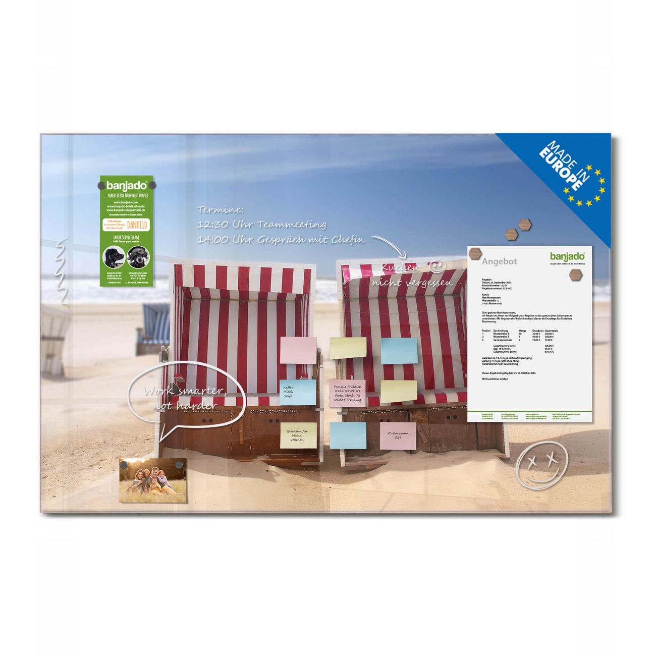 Ein Stück Design, das Ihren Alltag organisiert. Schreiben, heften, inspirieren - alles an einem Ort. Qualität, die man spürt. Montage leicht gemacht. Handwerk mit Herz - veredelt in Sachsen. Einzigartiges Design mit Motiv Motiv Strandkörbe Beschreibbare Glasoberfläche, leicht zu reinigen Starke Magnetkraft durch Stahlrückwand Inklusive 4 Neodym-Magneten Flexible Montageoptionen Handveredelt in Sachsen - Qualität, die bleibt