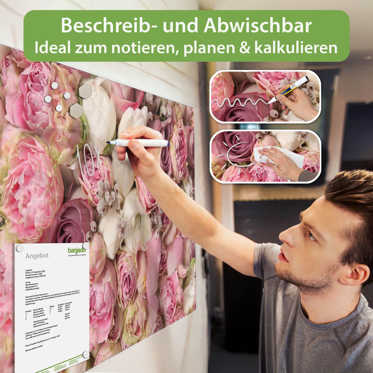 Material: 4mm Sicherheitsglas mit Metallrückwand Eigenschaften: beschreibbar, magnetisch, kratzfest Maße: 45x30x0,6cm, 2,03kg schwer Motiv Nummer 11473 Strauss Rosen Zubehör: inklusive 4 Neodym-Magnete