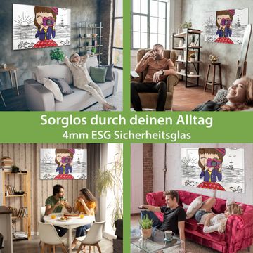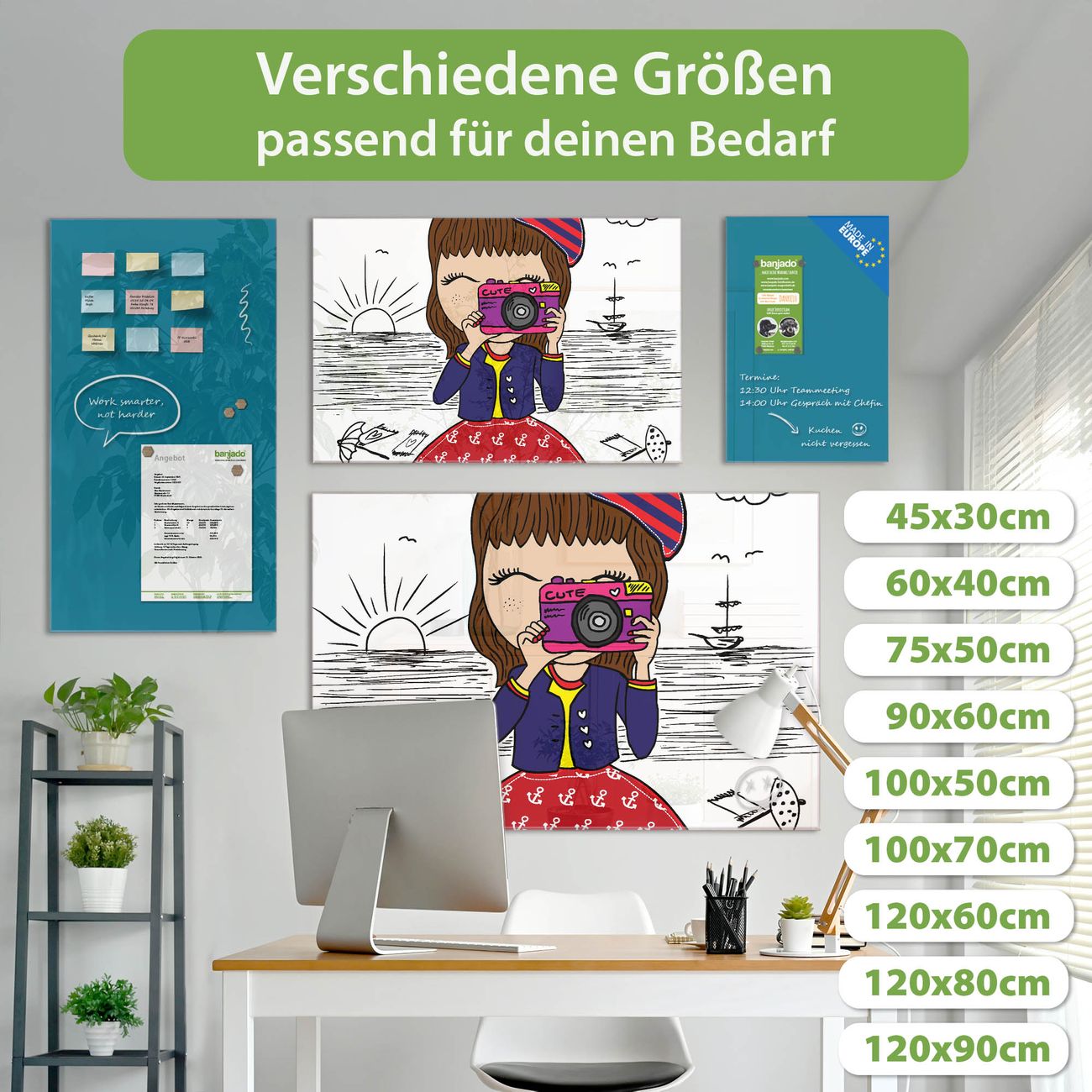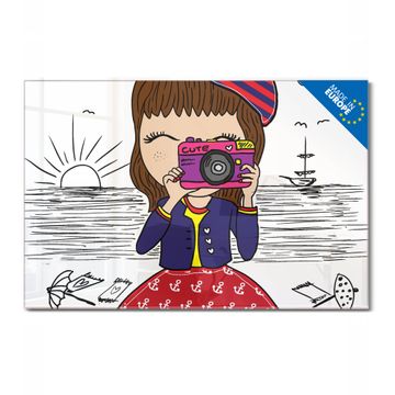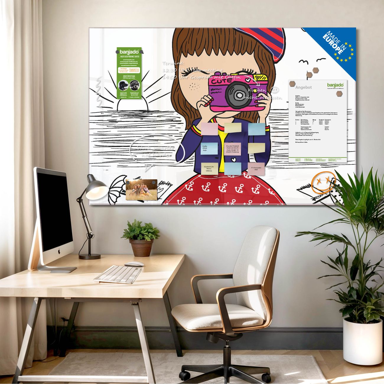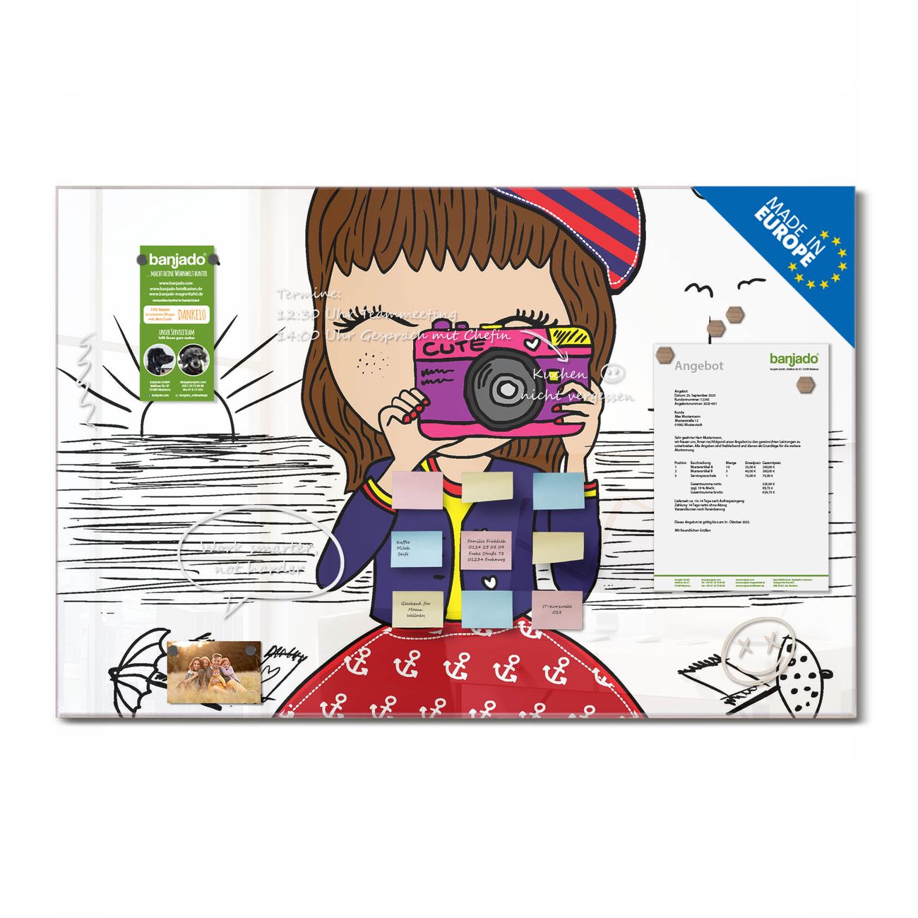 Material: 4mm Sicherheitsglas mit Metallrückwand Eigenschaften: beschreibbar, magnetisch, kratzfest Maße: 90x60x0,6cm, 8,10kg schwer Motiv Nummer 11127 Süße Kamera Zubehör: inklusive 4 Neodym-Magnete