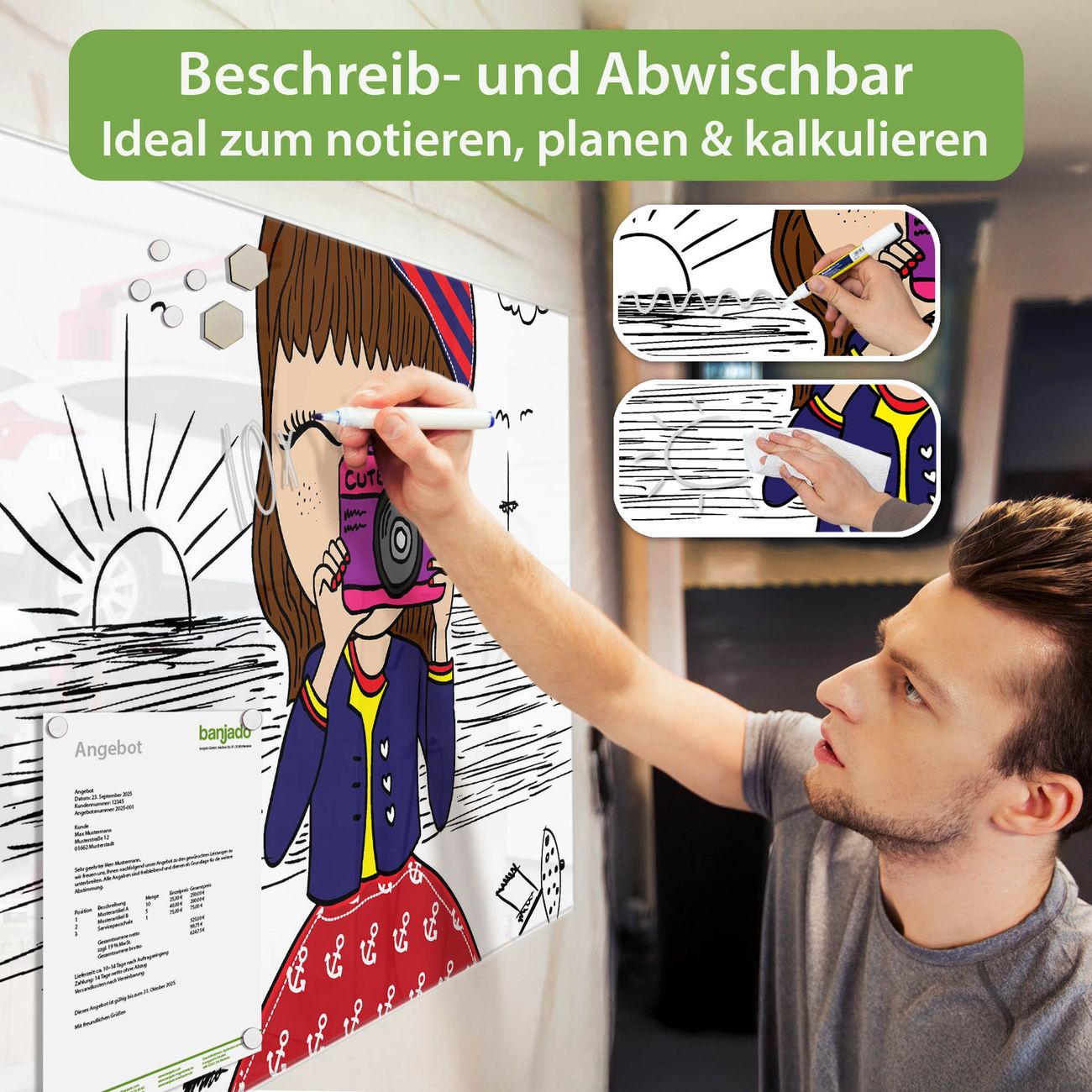 Jede Glas Magnettafel wird in unserer Werkstatt von Hand gefertigt und sorgfältig geprüft. So erhalten Sie ein echtes Qualitätsprodukt, das Funktion und Ästhetik perfekt vereint.?? Warum banjado?