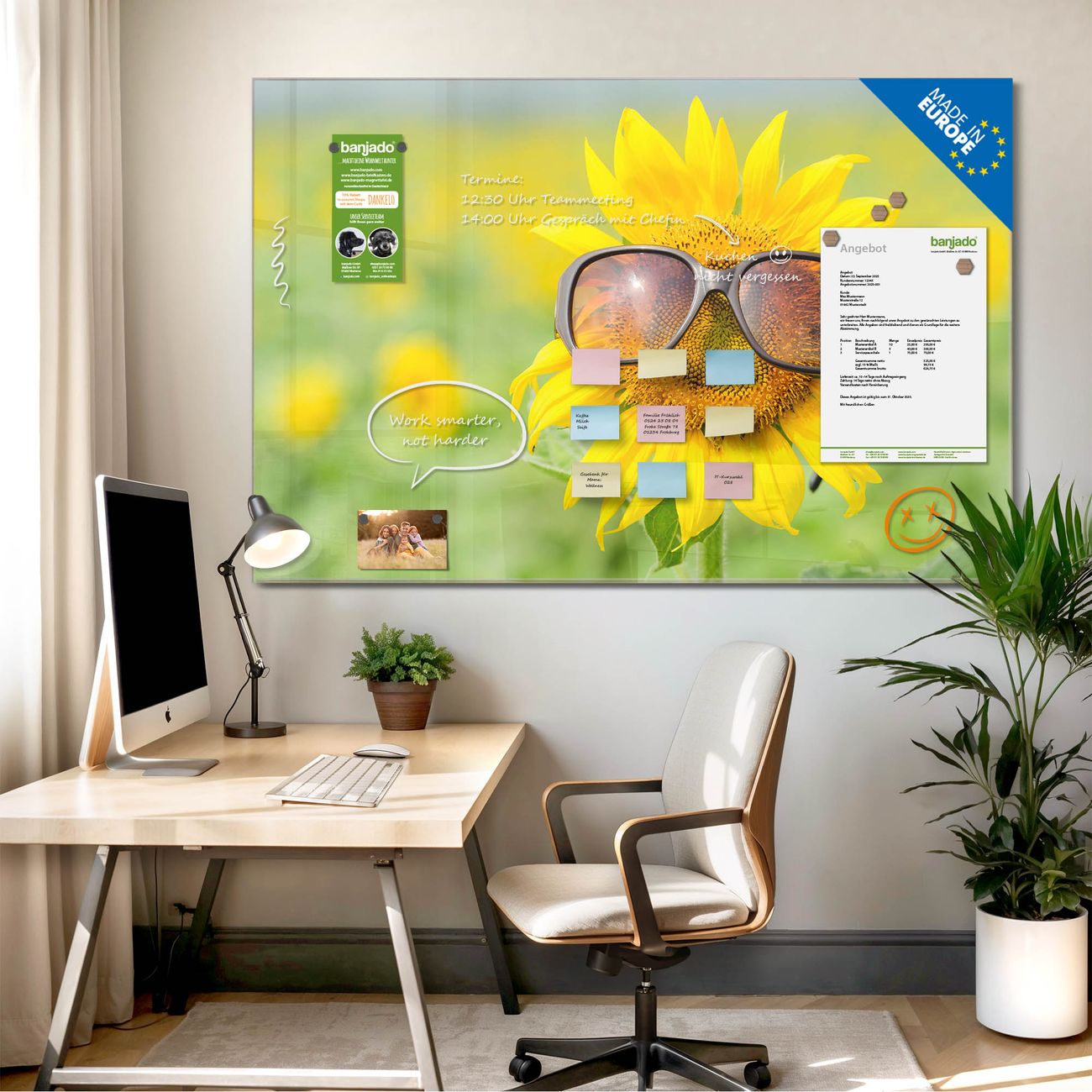 Die banjado Glas Magnettafel mit dem Motiv Motiv Sunny verbindet Funktionalität mit Stil. Sie ersetzt das Zettelchaos durch klare Strukturen und bringt dabei eine warme, natürliche Atmosphäre in Ihr Zuhause. Ob im Büro, in der Küche oder im Eingangsbereich - dieses Design-Board zieht Blicke an und sorgt für Ordnung mit Charakter.