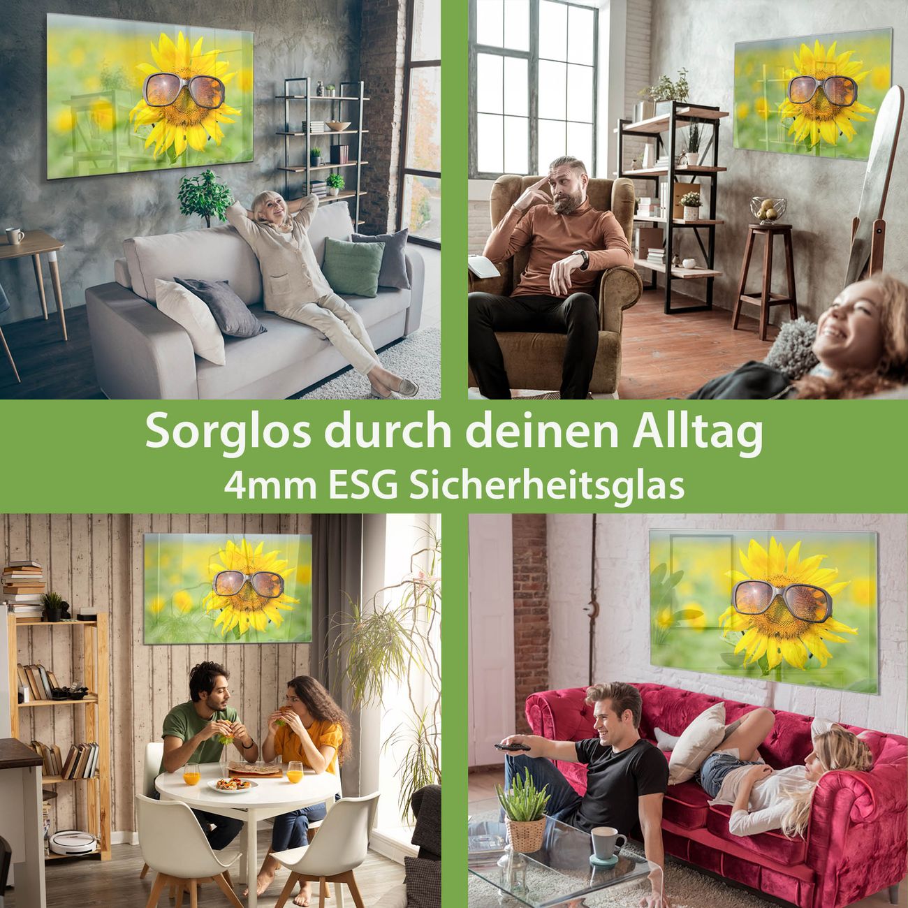 Material: 4mm Sicherheitsglas mit Metallrückwand Eigenschaften: beschreibbar, magnetisch, kratzfest Maße: 75x50x0,6cm, 5,63kg schwer Motiv Nummer 12111 Sunny Zubehör: inklusive 4 Neodym-Magnete