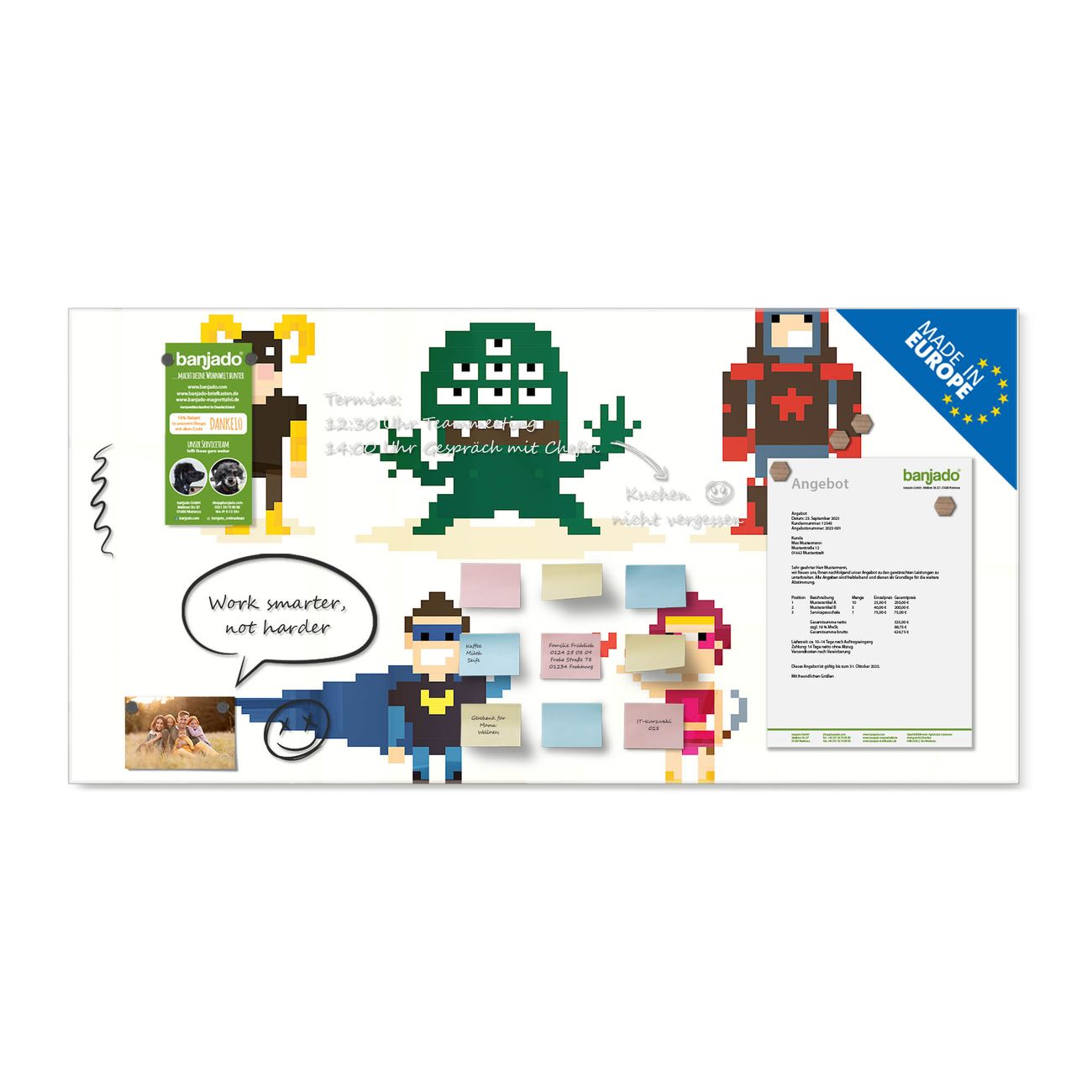 Ein Stück Design, das Ihren Alltag organisiert. Schreiben, heften, inspirieren - alles an einem Ort. Qualität, die man spürt. Montage leicht gemacht. Handwerk mit Herz - veredelt in Sachsen. Einzigartiges Design mit Motiv Motiv Superhelden Beschreibbare Glasoberfläche, leicht zu reinigen Starke Magnetkraft durch Stahlrückwand Inklusive 4 Neodym-Magneten Flexible Montageoptionen Handveredelt in Sachsen - Qualität, die bleibt