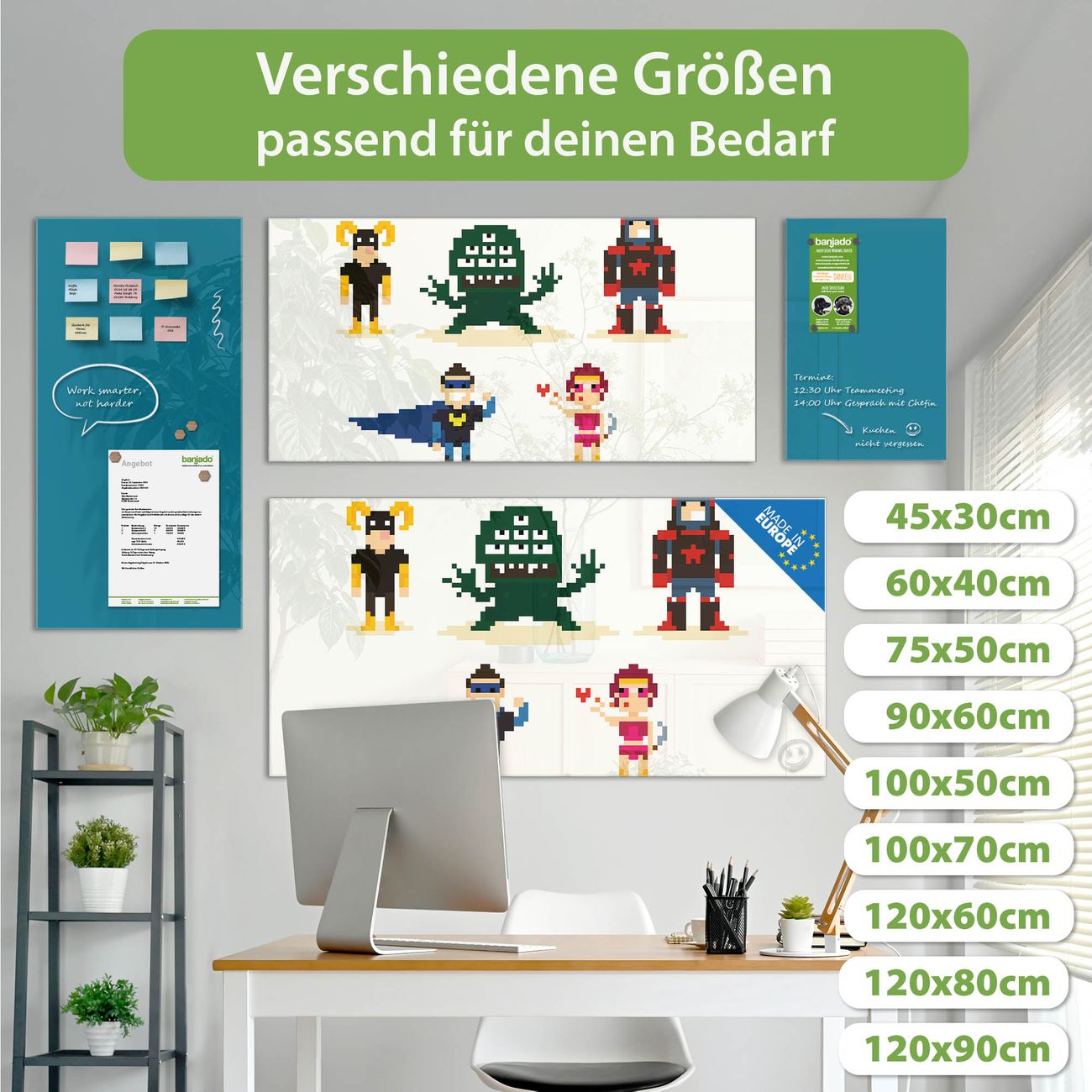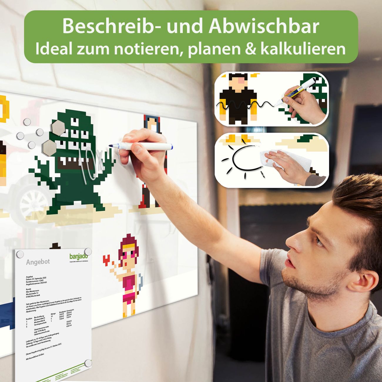 Jede Glas Magnettafel wird in unserer Werkstatt von Hand gefertigt und sorgfältig geprüft. So erhalten Sie ein echtes Qualitätsprodukt, das Funktion und Ästhetik perfekt vereint.?? Warum banjado?