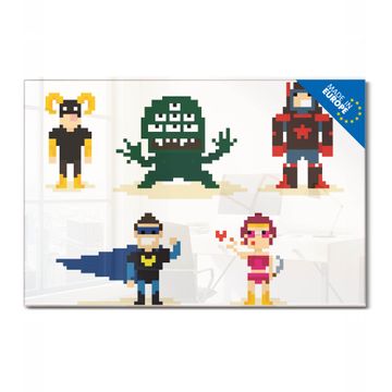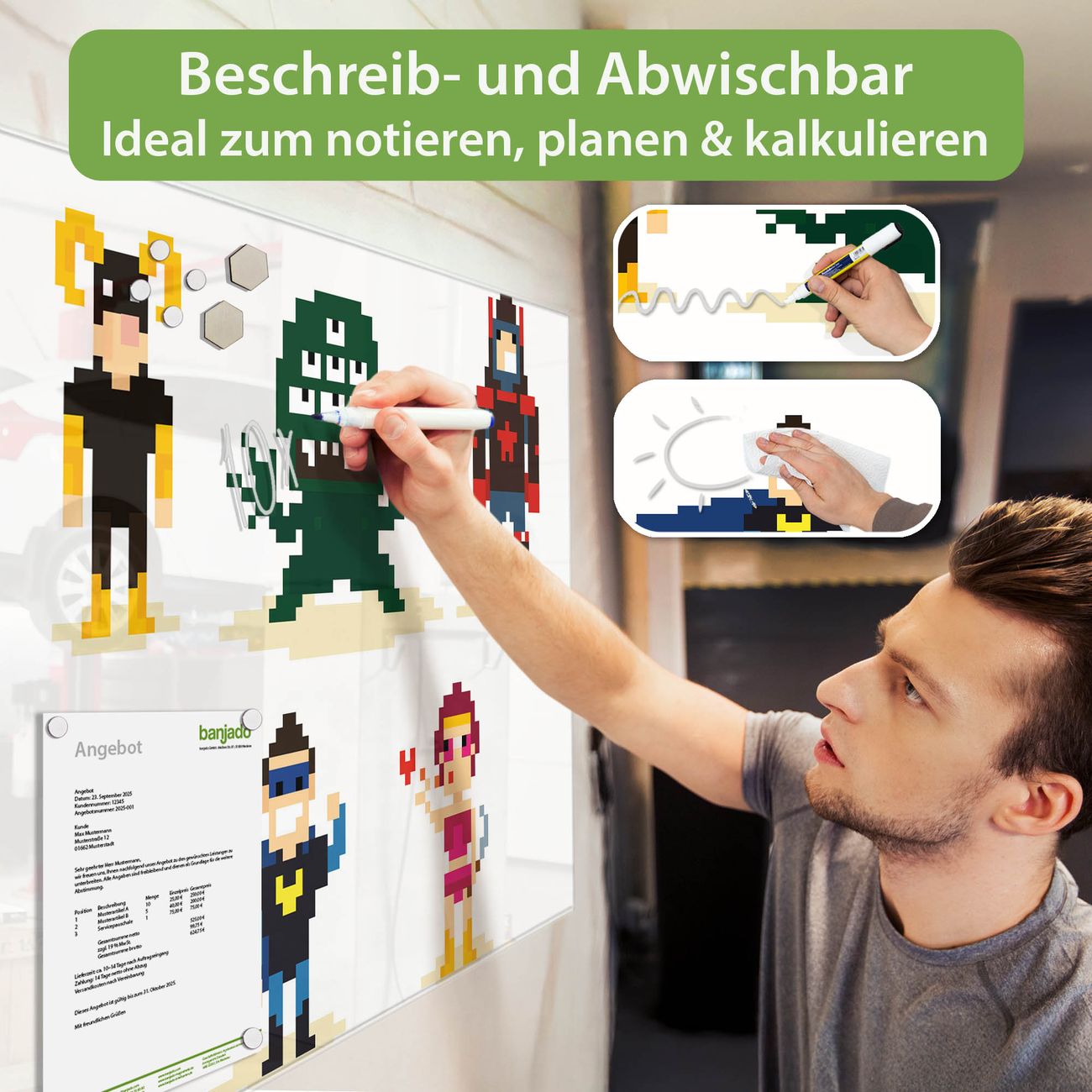 Material: 4mm Sicherheitsglas mit Metallrückwand Eigenschaften: beschreibbar, magnetisch, kratzfest Maße: 120x80x0,6cm, 14,40kg schwer Motiv Nummer 12629 Superhelden Zubehör: inklusive 4 Neodym-Magnete