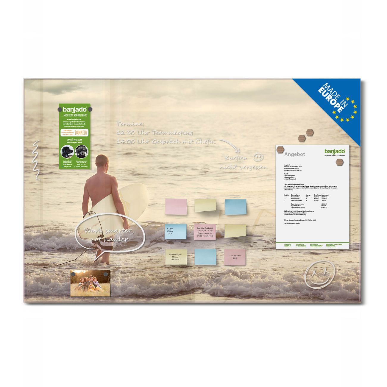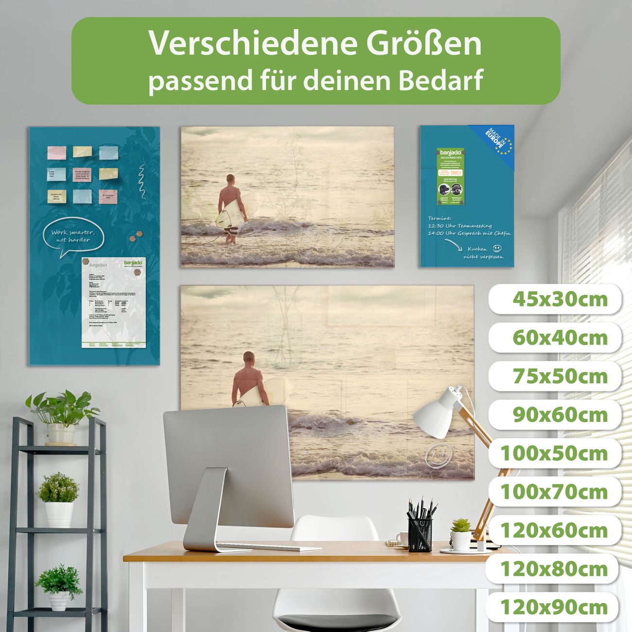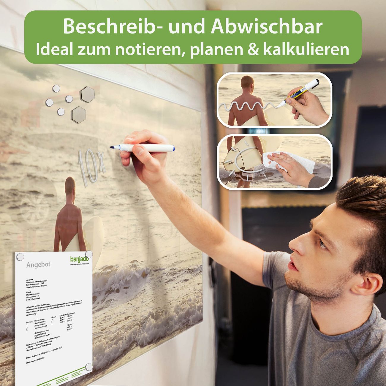 Material: 4mm Sicherheitsglas mit Metallrückwand Eigenschaften: beschreibbar, magnetisch, kratzfest Maße: 120x80x0,6cm, 14,40kg schwer Motiv Nummer 10632 Wellenreiten Gehen 2 Zubehör: inklusive 4 Neodym-Magnete