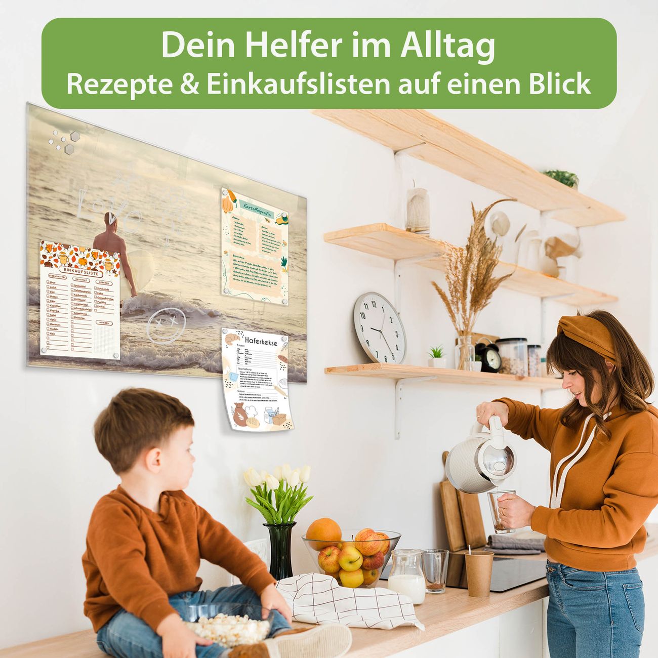 Auf der glatten Glasoberfläche lassen sich Termine, Rezepte oder Notizen ganz einfach mit Kreidestiften festhalten und rückstandslos entfernen. Starke Neodym-Magnete halten Ihre wichtigsten Erinnerungen sicher an Ort und Stelle. So entsteht Ihre ganz persönliche Ideenwand - jeden Tag neu.