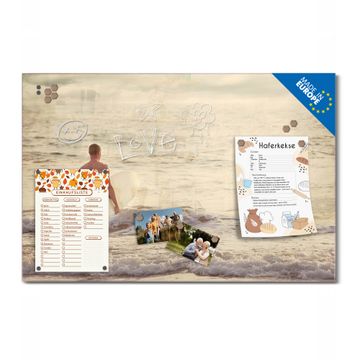 Material: 4mm Sicherheitsglas mit Metallrückwand Eigenschaften: beschreibbar, magnetisch, kratzfest Maße: 75x50x0,6cm, 5,63kg schwer Motiv Nummer 10632 Wellenreiten Gehen 2 Zubehör: inklusive 4 Neodym-Magnete