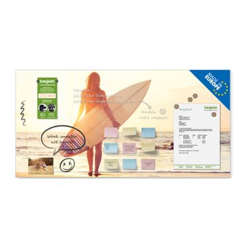 Material: 4mm Sicherheitsglas mit Metallrückwand Eigenschaften: beschreibbar, magnetisch, kratzfest Maße: 110x55x0,6cm, 9,08kg schwer Motiv Nummer 12536 Surfer Girl Zubehör: inklusive 4 Neodym-Magnete