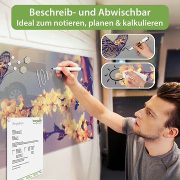 Auf der glatten Glasoberfläche lassen sich Termine, Rezepte oder Notizen ganz einfach mit Kreidestiften festhalten und rückstandslos entfernen. Starke Neodym-Magnete halten Ihre wichtigsten Erinnerungen sicher an Ort und Stelle. So entsteht Ihre ganz persönliche Ideenwand - jeden Tag neu.