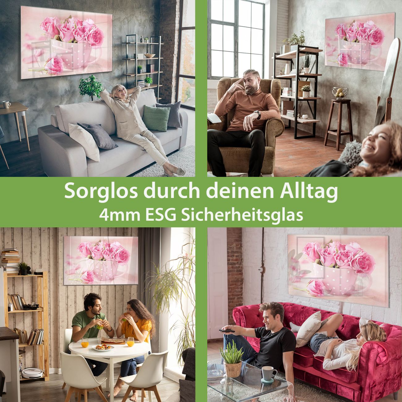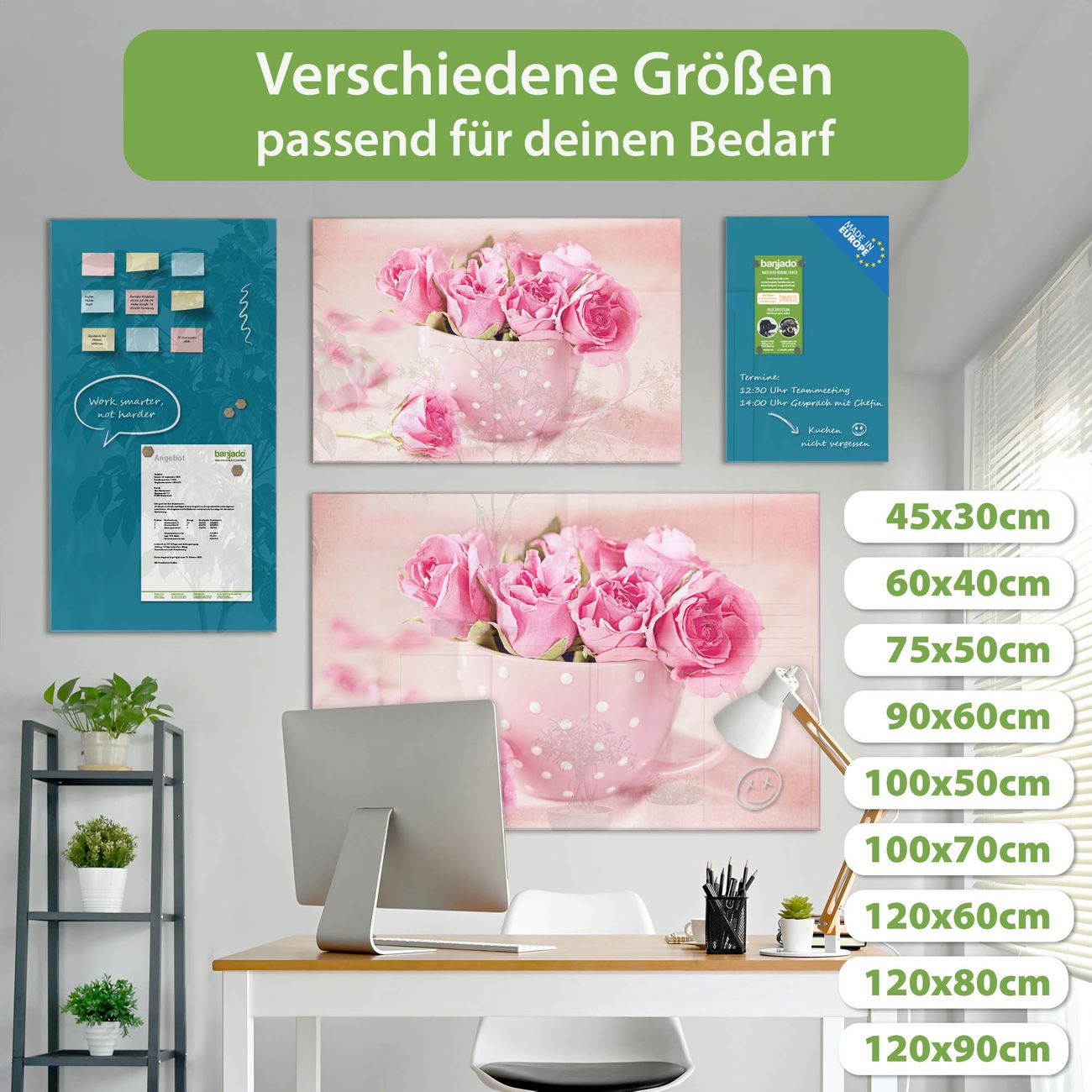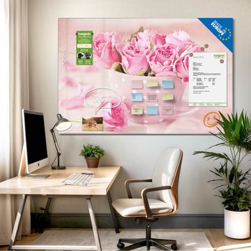 Material: 4mm Sicherheitsglas mit Metallrückwand Eigenschaften: beschreibbar, magnetisch, kratzfest Maße: 75x50x0,6cm, 5,63kg schwer Motiv Nummer 12338 Tasse Voll Rosen Zubehör: inklusive 4 Neodym-Magnete
