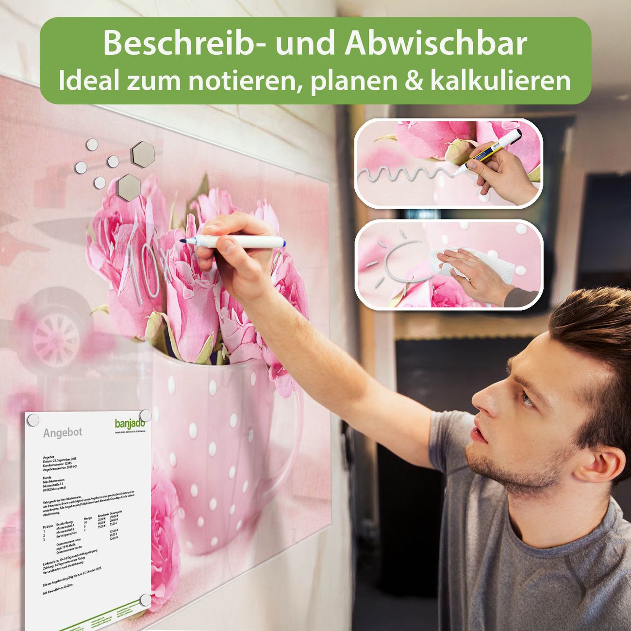 Die banjado Glas Magnettafel mit dem Motiv Motiv Tasse Voll Rosen verbindet Funktionalität mit Stil. Sie ersetzt das Zettelchaos durch klare Strukturen und bringt dabei eine warme, natürliche Atmosphäre in Ihr Zuhause. Ob im Büro, in der Küche oder im Eingangsbereich - dieses Design-Board zieht Blicke an und sorgt für Ordnung mit Charakter.