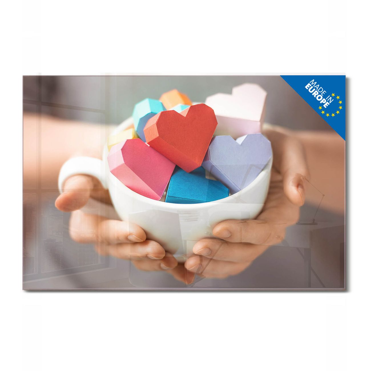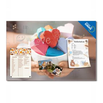 Material: 4mm Sicherheitsglas mit Metallrückwand Eigenschaften: beschreibbar, magnetisch, kratzfest Maße: 45x30x0,6cm, 2,03kg schwer Motiv Nummer 11545 Tasse voller Herzen Zubehör: inklusive 4 Neodym-Magnete