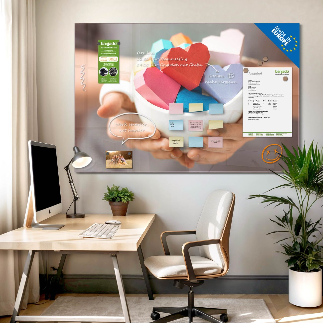 Jede Glas Magnettafel wird in unserer Werkstatt von Hand gefertigt und sorgfältig geprüft. So erhalten Sie ein echtes Qualitätsprodukt, das Funktion und Ästhetik perfekt vereint.?? Warum banjado?