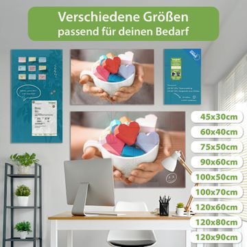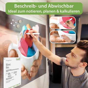 Auf der glatten Glasoberfläche lassen sich Termine, Rezepte oder Notizen ganz einfach mit Kreidestiften festhalten und rückstandslos entfernen. Starke Neodym-Magnete halten Ihre wichtigsten Erinnerungen sicher an Ort und Stelle. So entsteht Ihre ganz persönliche Ideenwand - jeden Tag neu.