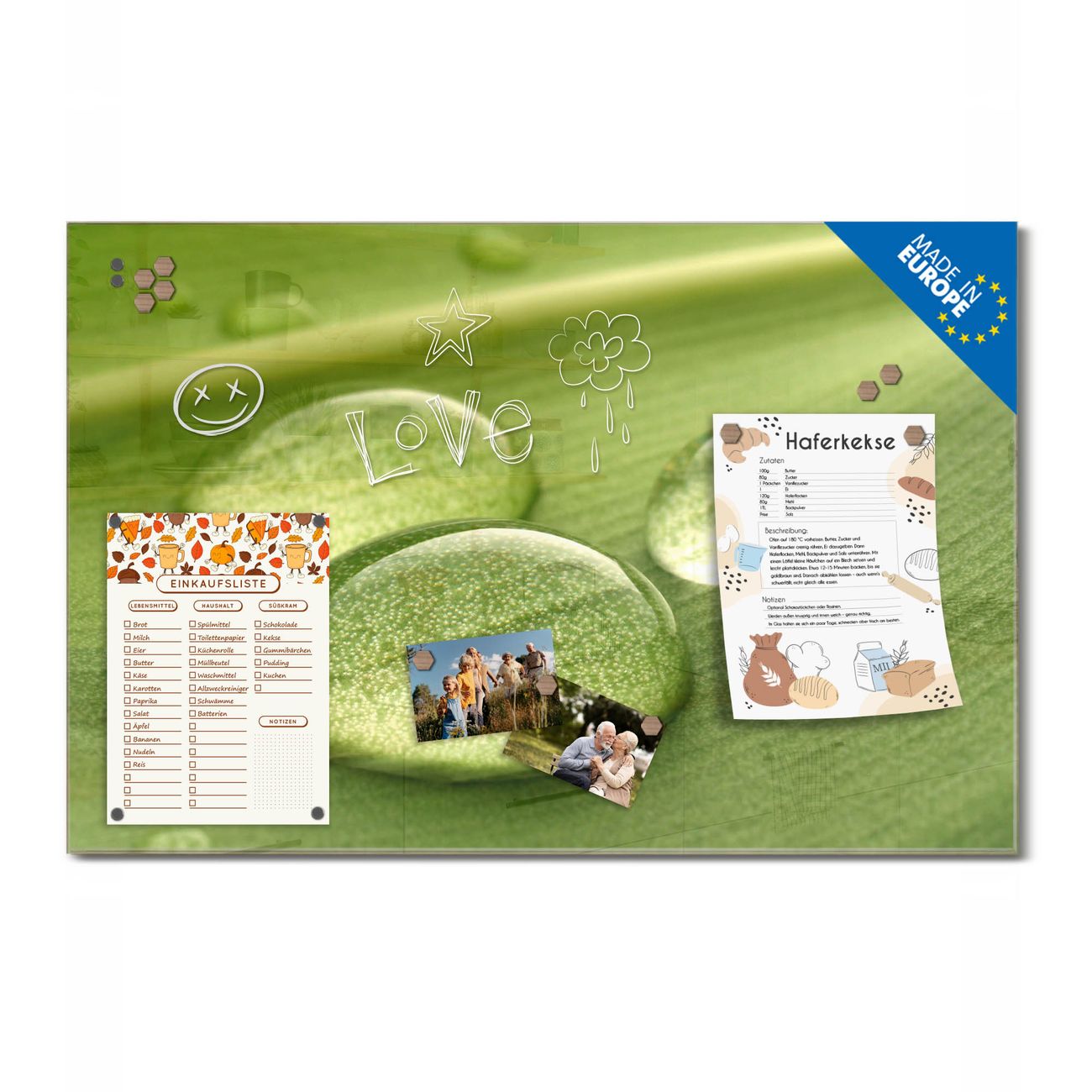 Material: 4mm Sicherheitsglas mit Metallrückwand Eigenschaften: beschreibbar, magnetisch, kratzfest Maße: 75x50x0,6cm, 5,63kg schwer Motiv Nummer 10288 Tautropfen Zubehör: inklusive 4 Neodym-Magnete