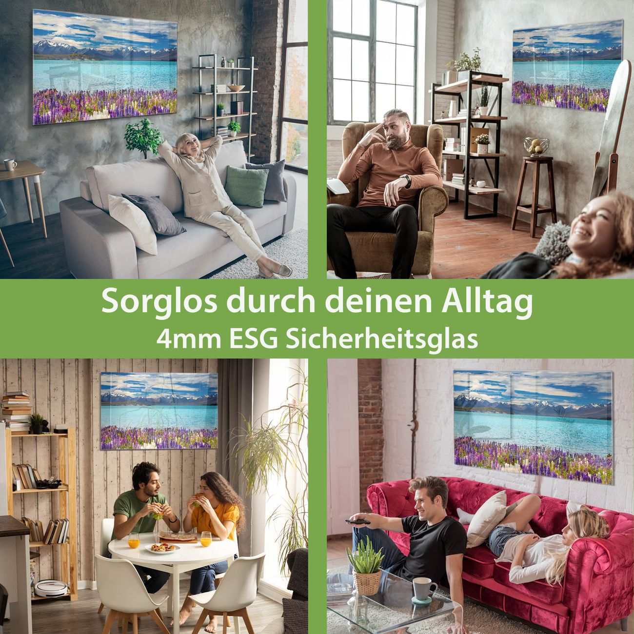 Material: 4mm Sicherheitsglas mit Metallrückwand Eigenschaften: beschreibbar, magnetisch, kratzfest Maße: 75x50x0,6cm, 5,63kg schwer Motiv Nummer 12264 Tekapo See Zubehör: inklusive 4 Neodym-Magnete