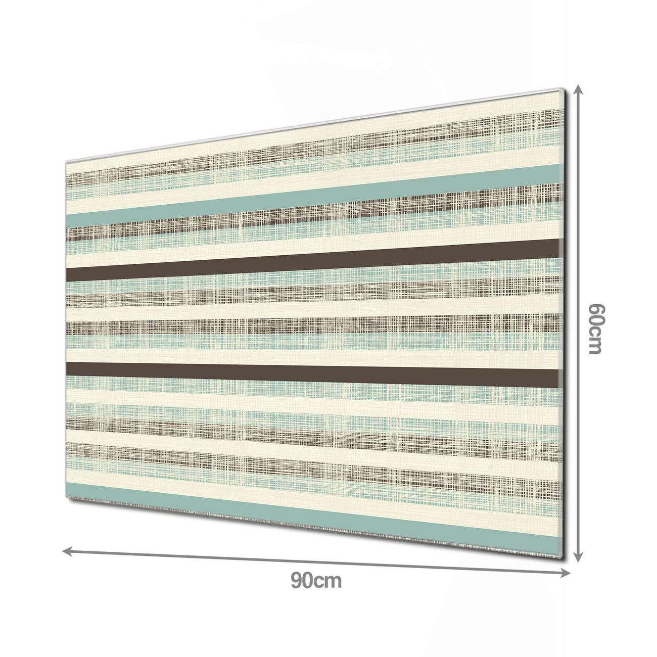 Material: 4mm Sicherheitsglas mit Metallrückwand Eigenschaften: beschreibbar, magnetisch, kratzfest Maße: 90x60x0,6cm, 8,10kg schwer Motiv Nummer 11315 Textile Streifen Zubehör: inklusive 4 Neodym-Magnete