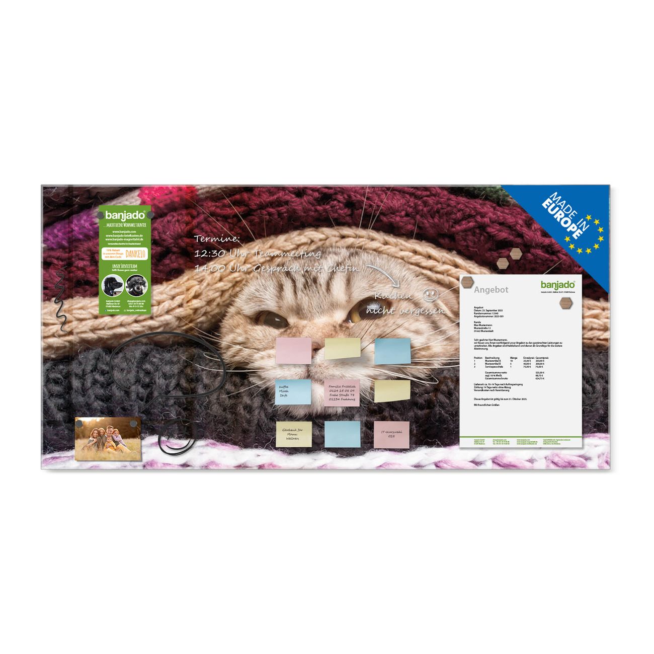 Material: 4mm Sicherheitsglas mit Metallrückwand Eigenschaften: beschreibbar, magnetisch, kratzfest Maße: 100x50x0,6cm, 7,50kg schwer Motiv Nummer 11702 Theo Zubehör: inklusive 4 Neodym-Magnete
