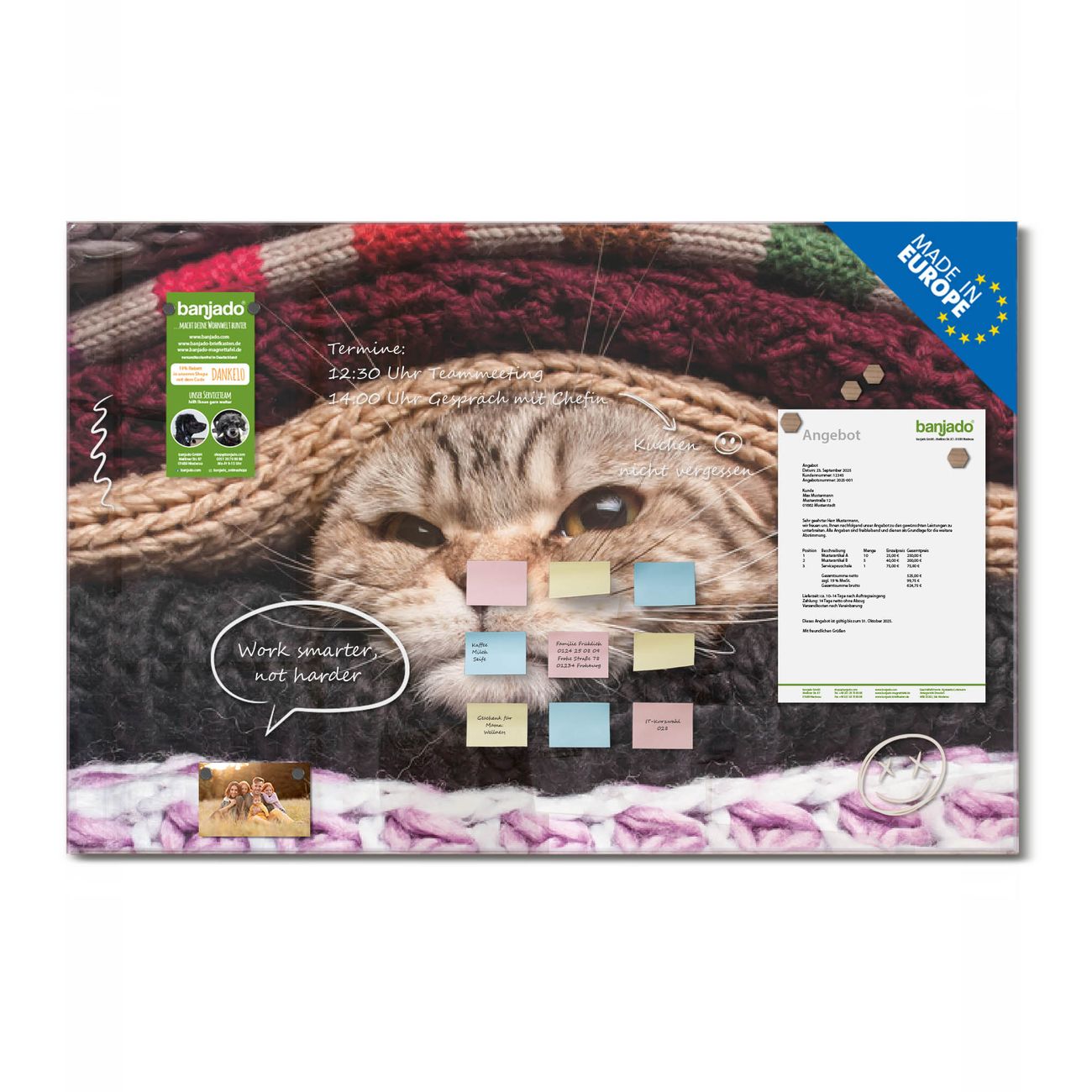Material: 4mm Sicherheitsglas mit Metallrückwand Eigenschaften: beschreibbar, magnetisch, kratzfest Maße: 90x60x0,6cm, 8,10kg schwer Motiv Nummer 11702 Theo Zubehör: inklusive 4 Neodym-Magnete