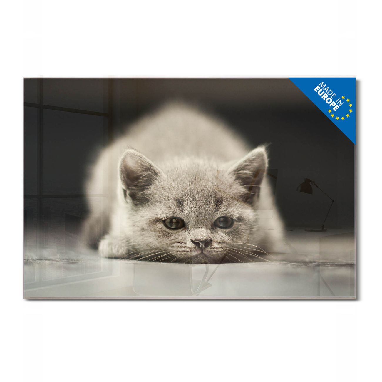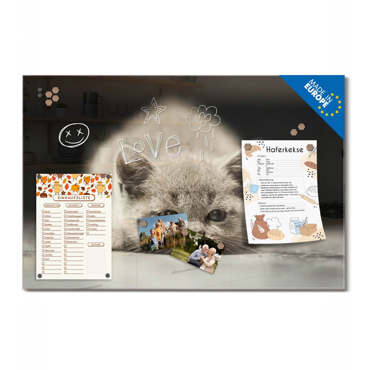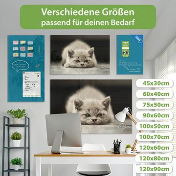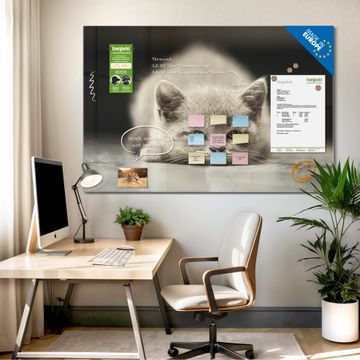 Material: 4mm Sicherheitsglas mit Metallrückwand Eigenschaften: beschreibbar, magnetisch, kratzfest Maße: 45x30x0,6cm, 2,03kg schwer Motiv Nummer 12374 Theodor Zubehör: inklusive 4 Neodym-Magnete