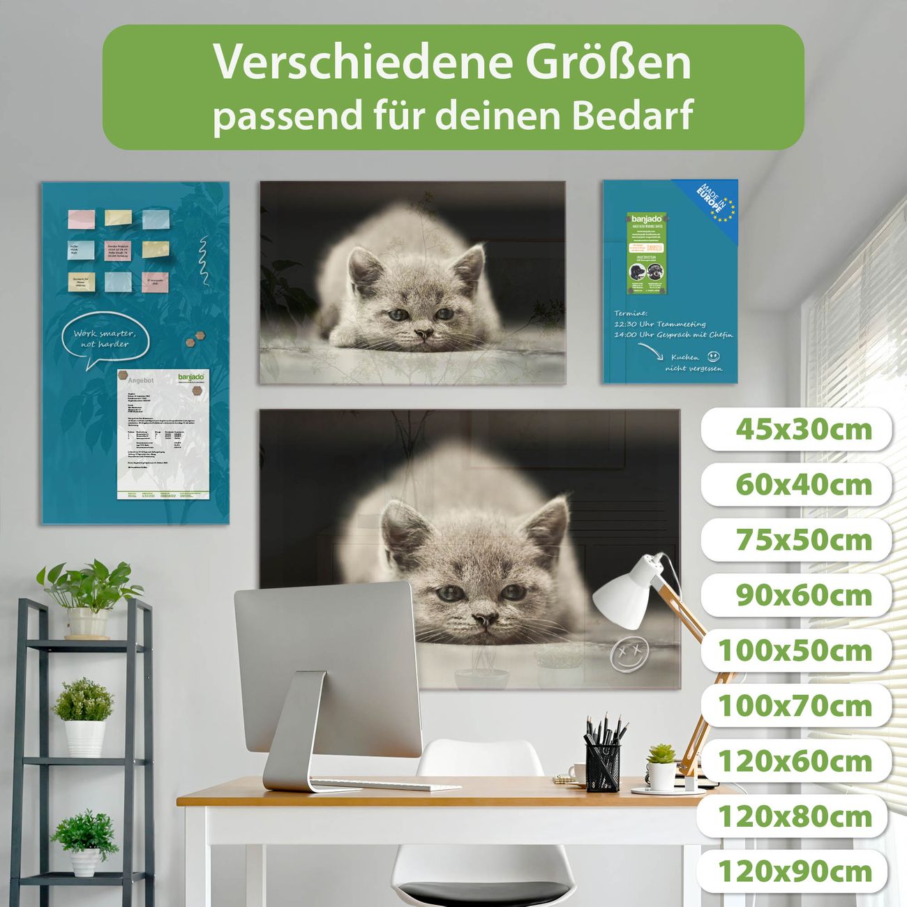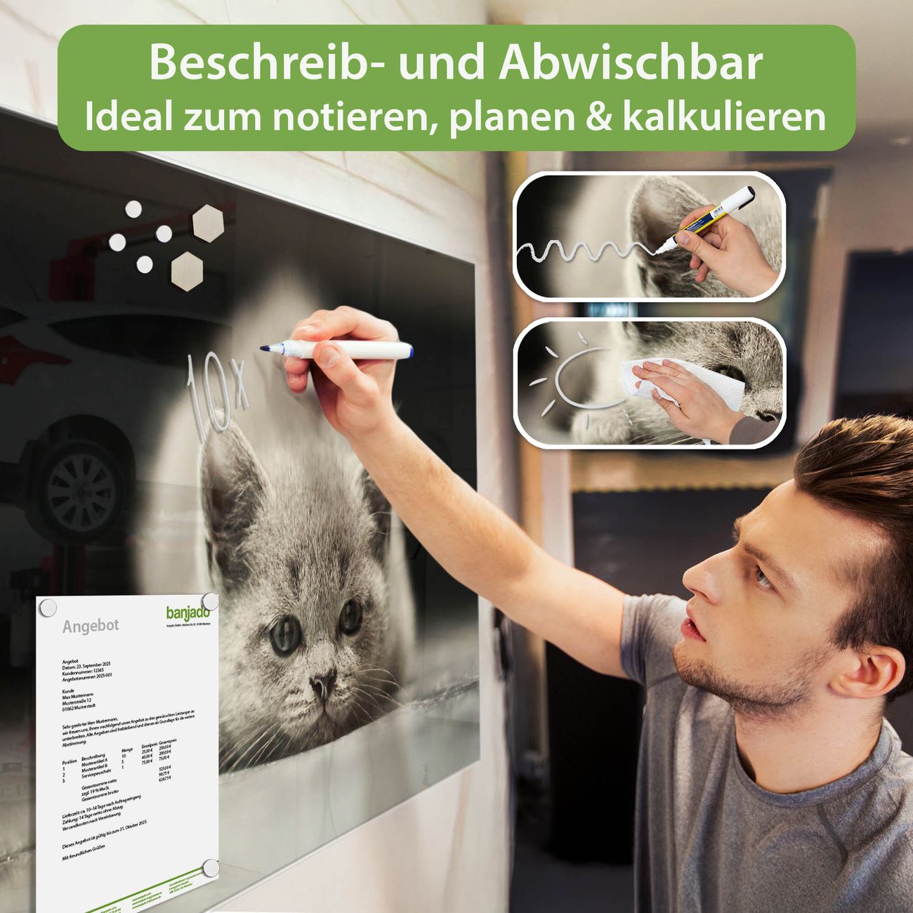 Jede Glas Magnettafel wird in unserer Werkstatt von Hand gefertigt und sorgfältig geprüft. So erhalten Sie ein echtes Qualitätsprodukt, das Funktion und Ästhetik perfekt vereint.?? Warum banjado?